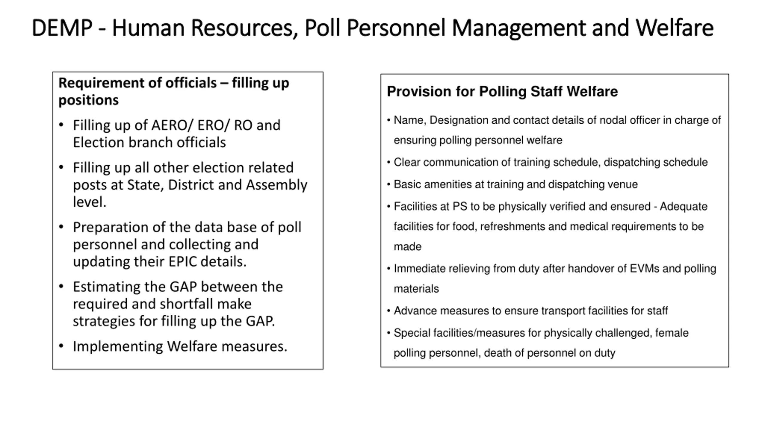 DEMP DEMP - - Human Resources, Poll Personnel Management and Welfare Human Resources, Poll Personnel Management and Welfare Requirement of officials filling up positions Filling up of AERO/ ERO/ RO and Election branch officials Filling up all other election related posts at State, District and Assembly level. Preparation of the data base of poll personnel and collecting and updating their EPIC details. Estimating the GAP between the required and shortfall make strategies for filling up the GAP. Implementing Welfare measures. Provision for Polling Staff Welfare Name, Designation and contact details of nodal officer in charge of ensuring polling personnel welfare Clear communication of training schedule, dispatching schedule Basic amenities at training and dispatching venue Facilities at PS to be physically verified and ensured - Adequate facilities for food, refreshments and medical requirements to be made Immediate relieving from duty after handover of EVMs and polling materials Advance measures to ensure transport facilities for staff Special facilities/measures for physically challenged, female polling personnel, death of personnel on duty