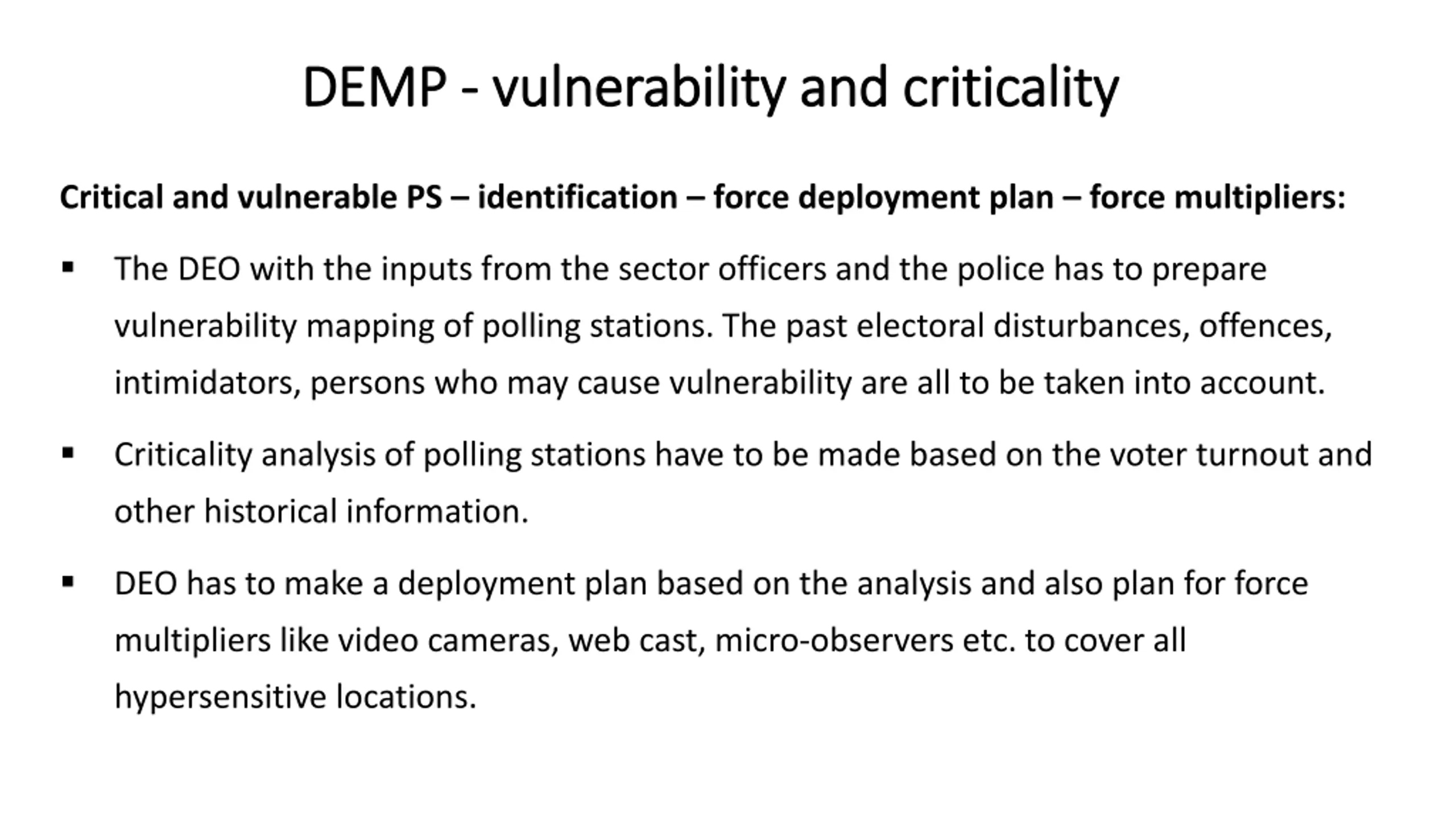 DEMP DEMP - - vulnerability and criticality vulnerability and criticality Critical and vulnerable PS identification force deployment plan force multipliers: The DEO with the inputs from the sector officers and the police has to prepare vulnerability mapping of polling stations. The past electoral disturbances, offences, intimidators, persons who may cause vulnerability are all to be taken into account. Criticality analysis of polling stations have to be made based on the voter turnout and other historical information. DEO has to make a deployment plan based on the analysis and also plan for force multipliers like video cameras, web cast, micro-observers etc. to cover all hypersensitive locations.