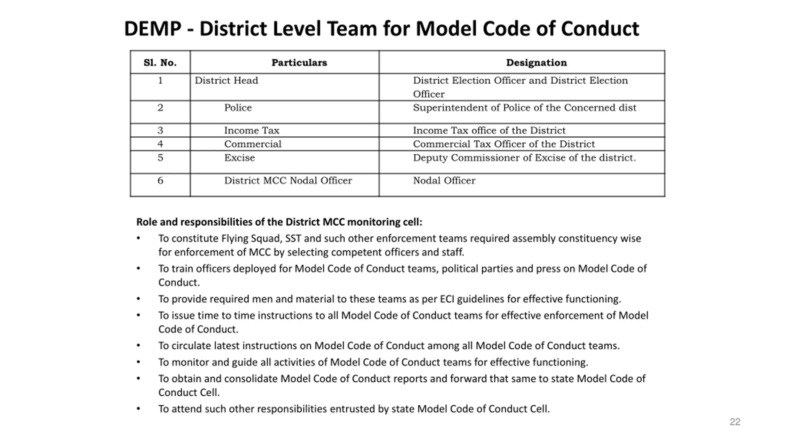 DEMP - District Level Team for Model Code of Conduct Sl. No. Particulars Designation 1 District Head District Election Officer and District Election Officer Superintendent of Police of the Concerned dist 2 Police 3 4 5 Income Tax Commercial Excise Income Tax office of the District Commercial Tax Officer of the District Deputy Commissioner of Excise of the district. 6 District MCC Nodal Officer Nodal Officer Role and responsibilities of the District MCC monitoring cell: To constitute Flying Squad, SST and such other enforcement teams required assembly constituency wise for enforcement of MCC by selecting competent officers and staff. To train officers deployed for Model Code of Conduct teams, political parties and press on Model Code of Conduct. To provide required men and material to these teams as per ECI guidelines for effective functioning. To issue time to time instructions to all Model Code of Conduct teams for effective enforcement of Model Code of Conduct. To circulate latest instructions on Model Code of Conduct among all Model Code of Conduct teams. To monitor and guide all activities of Model Code of Conduct teams for effective functioning. To obtain and consolidate Model Code of Conduct reports and forward that same to state Model Code of Conduct Cell. To attend such other responsibilities entrusted by state Model Code of Conduct Cell. 22