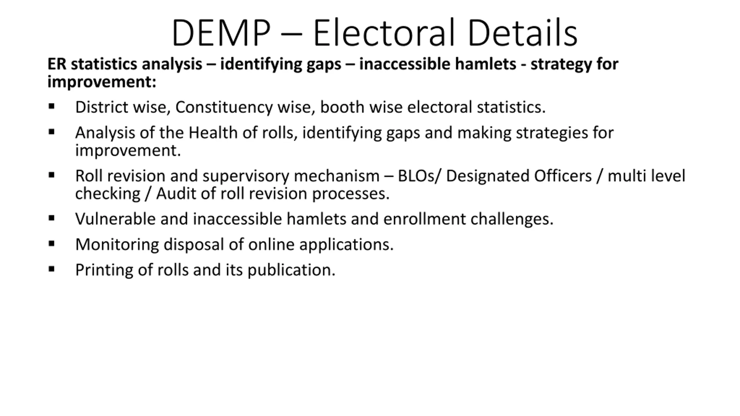 DEMP Electoral Details ER statistics analysis identifying gaps inaccessible hamlets - strategy for improvement: District wise, Constituency wise, booth wise electoral statistics. Analysis of the Health of rolls, identifying gaps and making strategies for improvement. Roll revision and supervisory mechanism BLOs/ Designated Officers / multi level checking / Audit of roll revision processes. Vulnerable and inaccessible hamlets and enrollment challenges. Monitoring disposal of online applications. Printing of rolls and its publication.