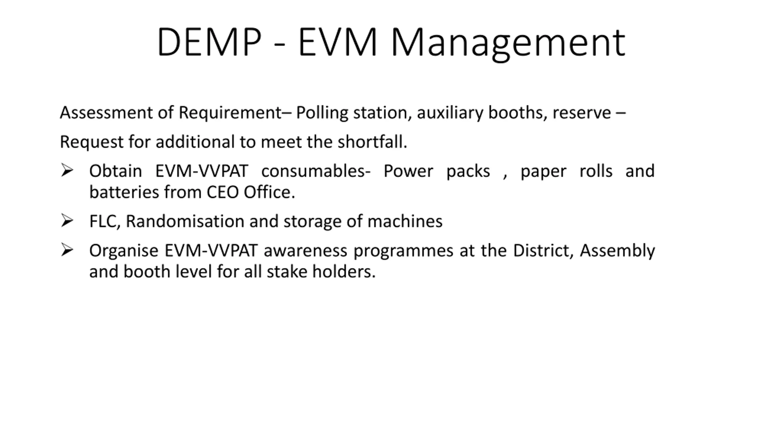 DEMP - EVM Management Assessment of Requirement Polling station, auxiliary booths, reserve Request for additional to meet the shortfall. Obtain EVM-VVPAT consumables- Power packs , paper rolls and batteries from CEO Office. FLC, Randomisation and storage of machines Organise EVM-VVPAT awareness programmes at the District, Assembly and booth level for all stake holders.
