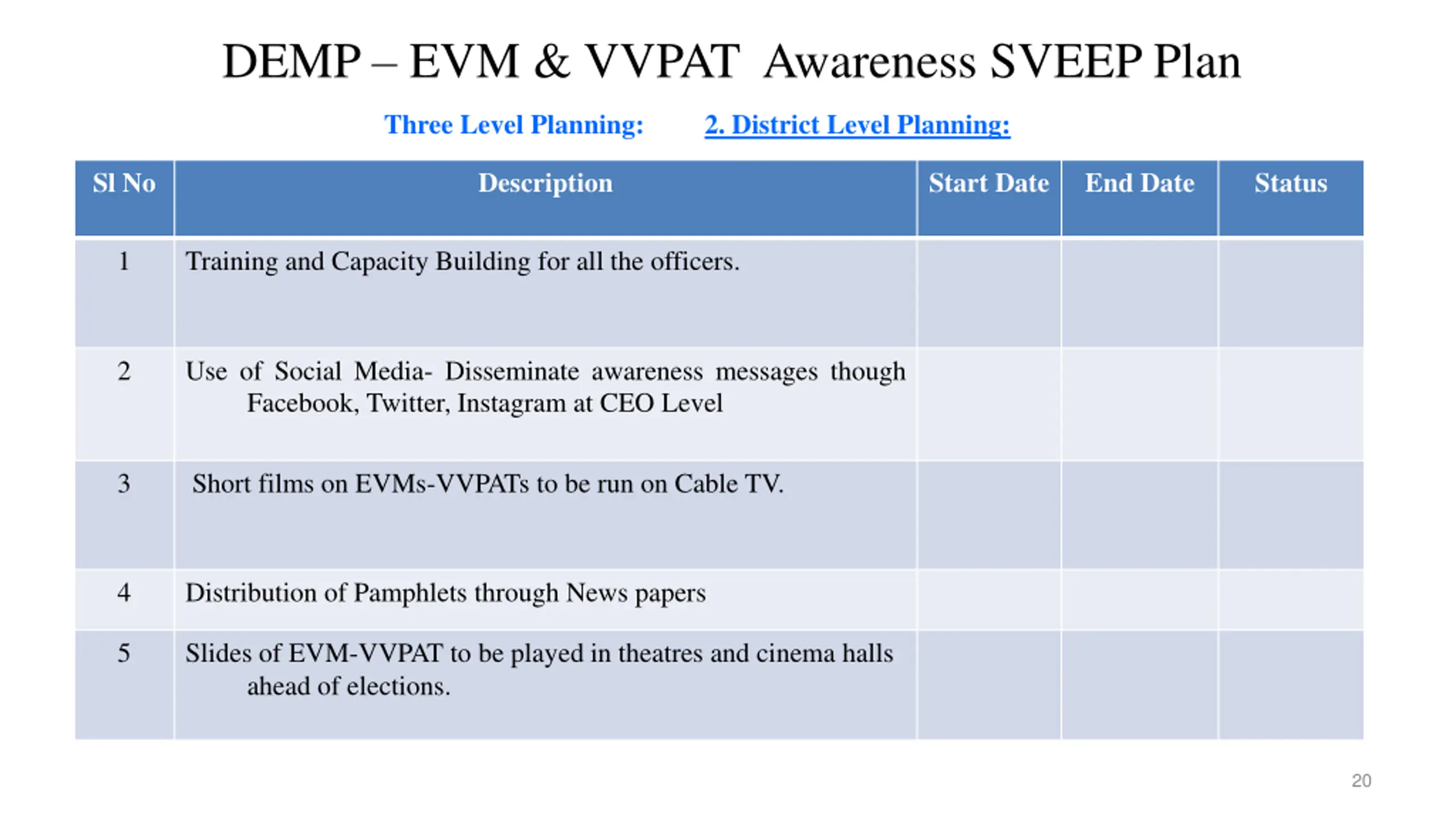 DEMP EVM & VVPAT Awareness SVEEP Plan Three Level Planning: 2. District Level Planning: Sl No Description Start Date End Date Status 1 Training and Capacity Building for all the officers. 2 Use of Social Media- Disseminate awareness messages though Facebook, Twitter, Instagram at CEO Level 3 Short films on EVMs-VVPATs to be run on Cable TV. 4 Distribution of Pamphlets through News papers 5 Slides of EVM-VVPAT to be played in theatres and cinema halls ahead of elections. 20