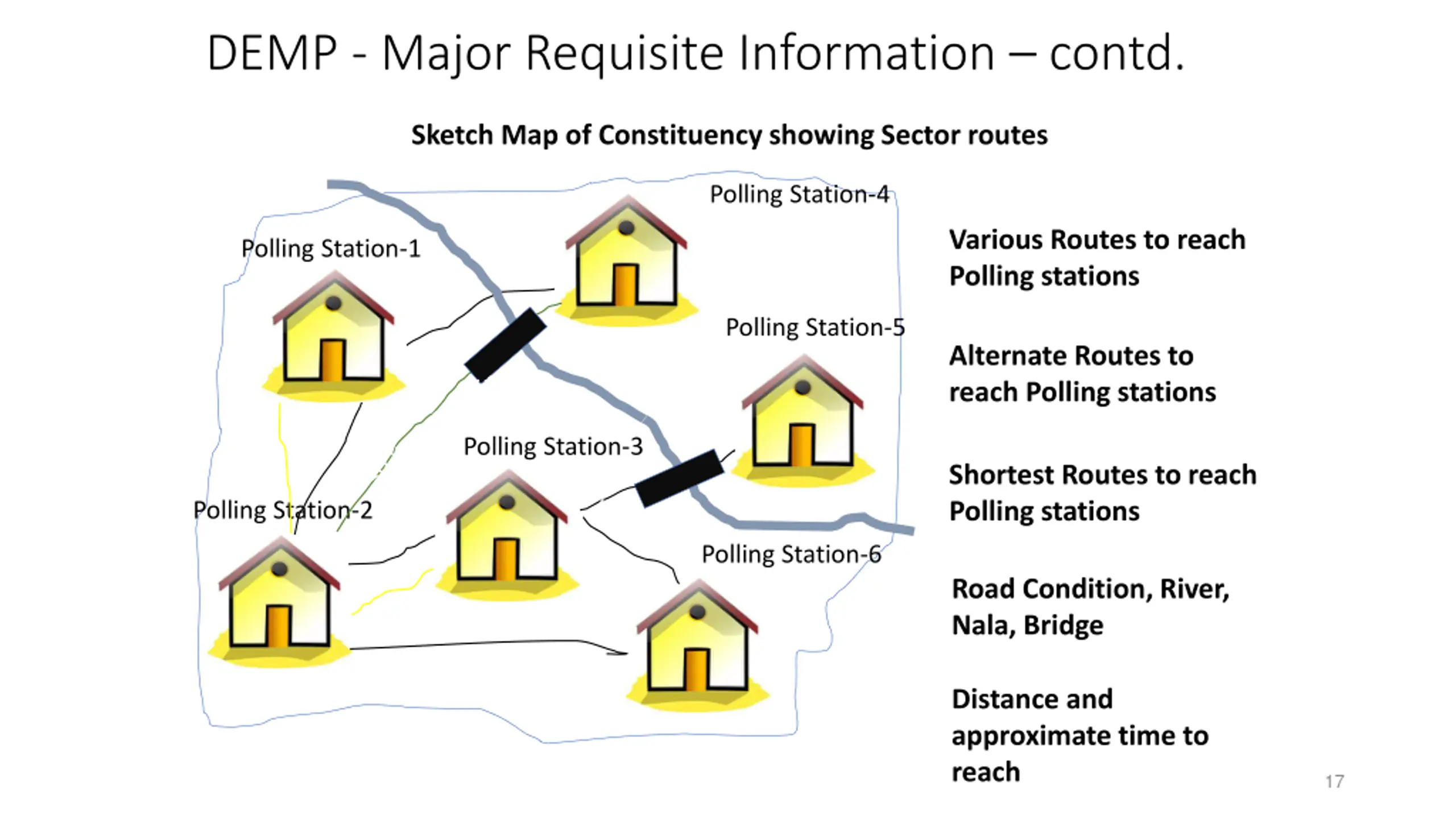 DEMP - Major Requisite Information contd. Sketch Map of Constituency showing Sector routes Polling Station-4 Various Routes to reach Polling stations Polling Station-1 Polling Station-5 Alternate Routes to reach Polling stations Polling Station-3 Shortest Routes to reach Polling stations Polling Station-2 Polling Station-6 Road Condition, River, Nala, Bridge Distance and approximate time to reach 17