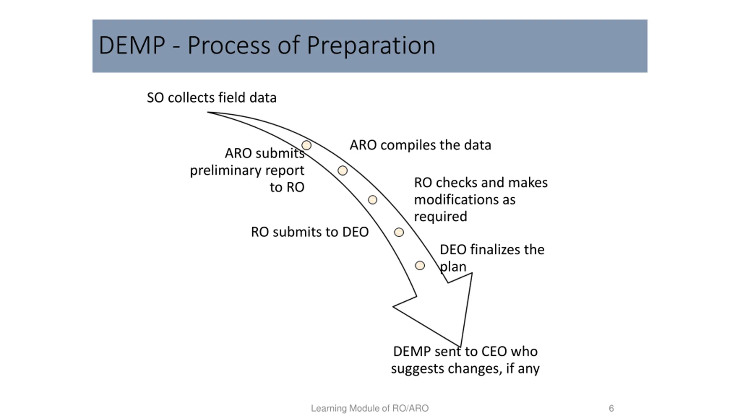 DEMP - Process of Preparation SO collects field data ARO compiles the data ARO submits preliminary report RO checks and makes modifications as required to RO RO submits to DEO DEO finalizes the plan DEMP sent to CEO who suggests changes, if any Learning Module of RO/ARO 6