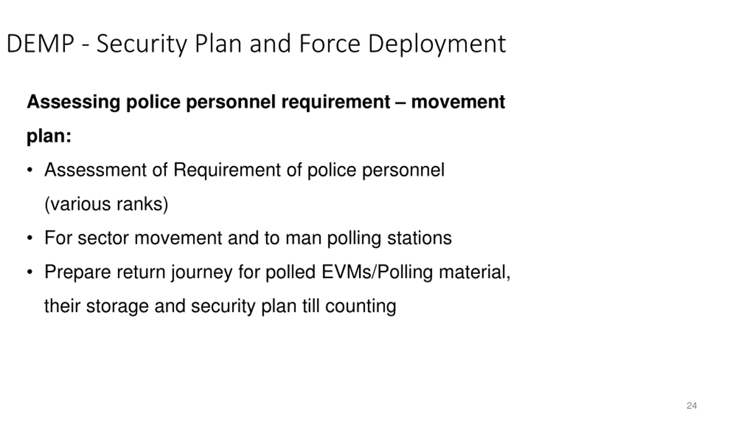 DEMP - Security Plan and Force Deployment Assessing police personnel requirement movement plan: Assessment of Requirement of police personnel (various ranks) For sector movement and to man polling stations Prepare return journey for polled EVMs/Polling material, their storage and security plan till counting 24