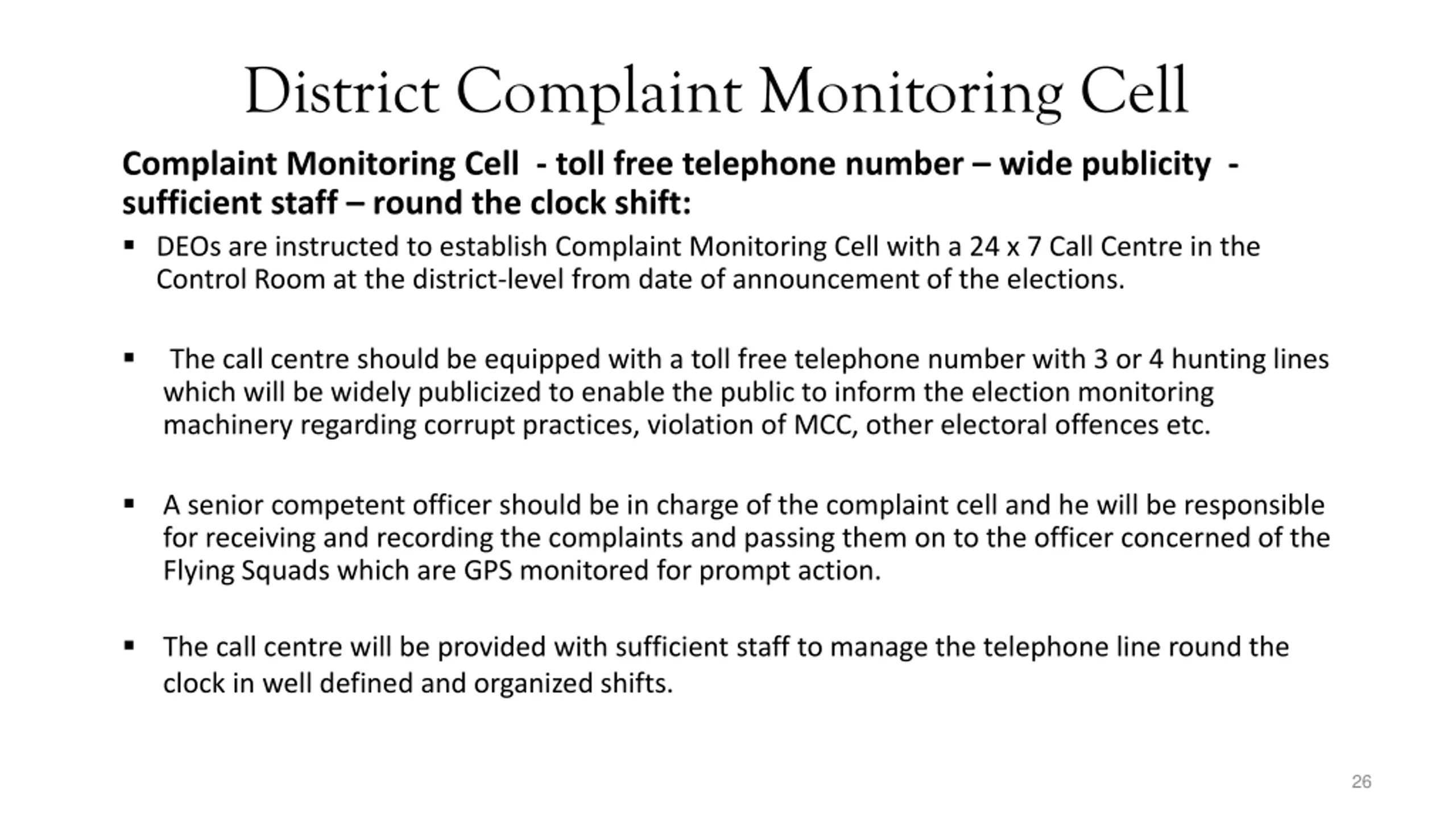 District Complaint Monitoring Cell Complaint Monitoring Cell - toll free telephone number wide publicity - sufficient staff round the clock shift: DEOs are instructed to establish Complaint Monitoring Cell with a 24 x 7 Call Centre in the Control Room at the district-level from date of announcement of the elections. The call centre should be equipped with a toll free telephone number with 3 or 4 hunting lines which will be widely publicized to enable the public to inform the election monitoring machinery regarding corrupt practices, violation of MCC, other electoral offences etc. A senior competent officer should be in charge of the complaint cell and he will be responsible for receiving and recording the complaints and passing them on to the officer concerned of the Flying Squads which are GPS monitored for prompt action. The call centre will be provided with sufficient staff to manage the telephone line round the clock in well defined and organized shifts. 26