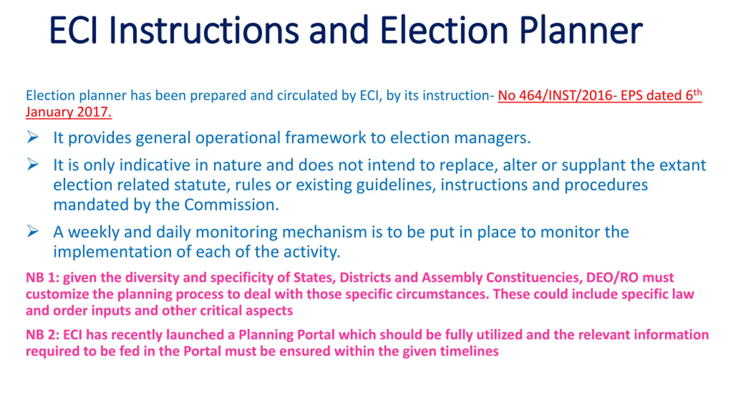 ECI Instructions and Election Planner ECI Instructions and Election Planner Election planner has been prepared and circulated by ECI, by its instruction- No 464/INST/2016- EPS dated 6th January 2017. It provides general operational framework to election managers. It is only indicative in nature and does not intend to replace, alter or supplant the extant election related statute, rules or existing guidelines, instructions and procedures mandated by the Commission. A weekly and daily monitoring mechanism is to be put in place to monitor the implementation of each of the activity. NB 1: given the diversity and specificity of States, Districts and Assembly Constituencies, DEO/RO must customize the planning process to deal with those specific circumstances. These could include specific law and order inputs and other critical aspects NB 2: ECI has recently launched a Planning Portal which should be fully utilized and the relevant information required to be fed in the Portal must be ensured within the given timelines