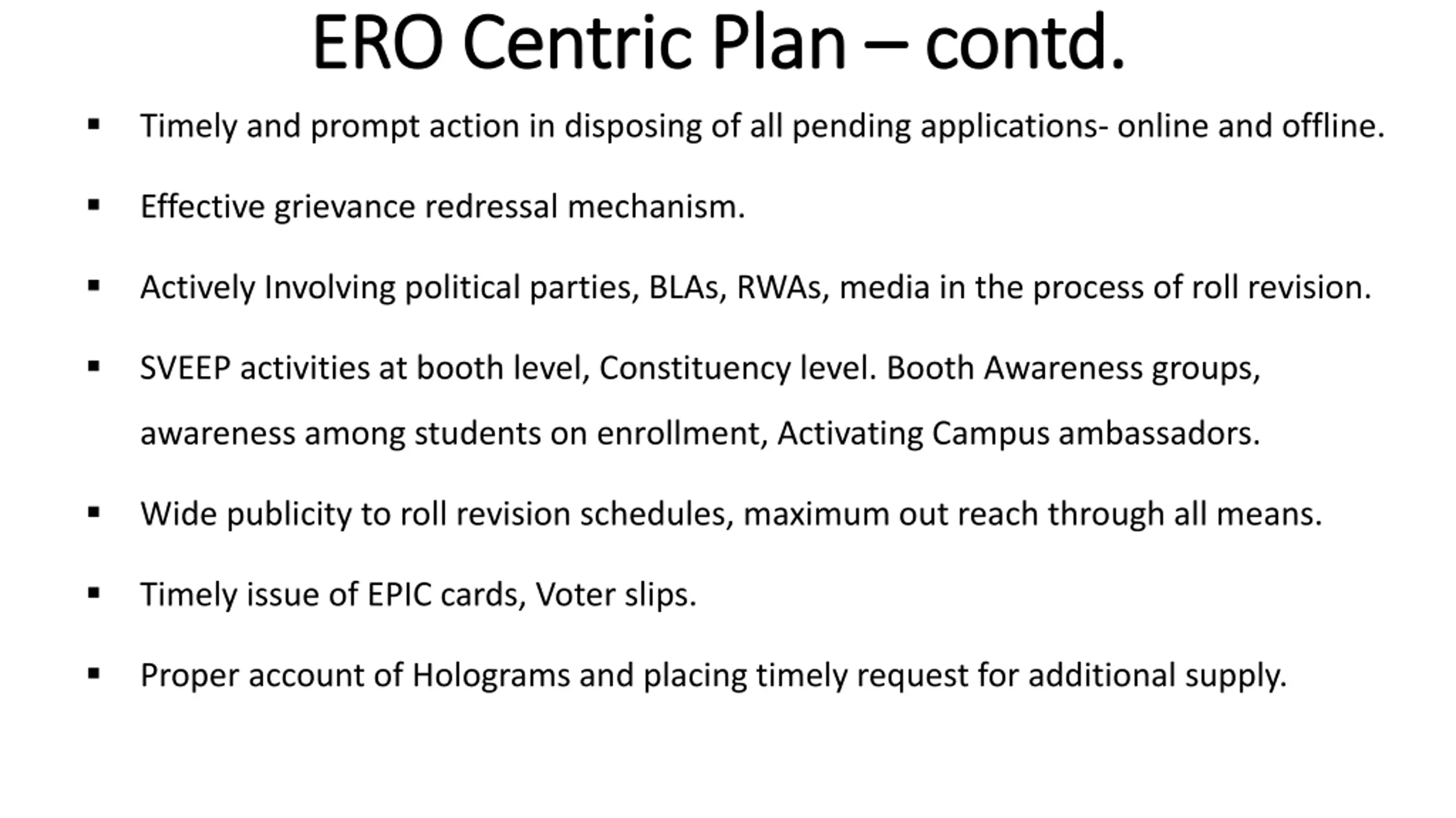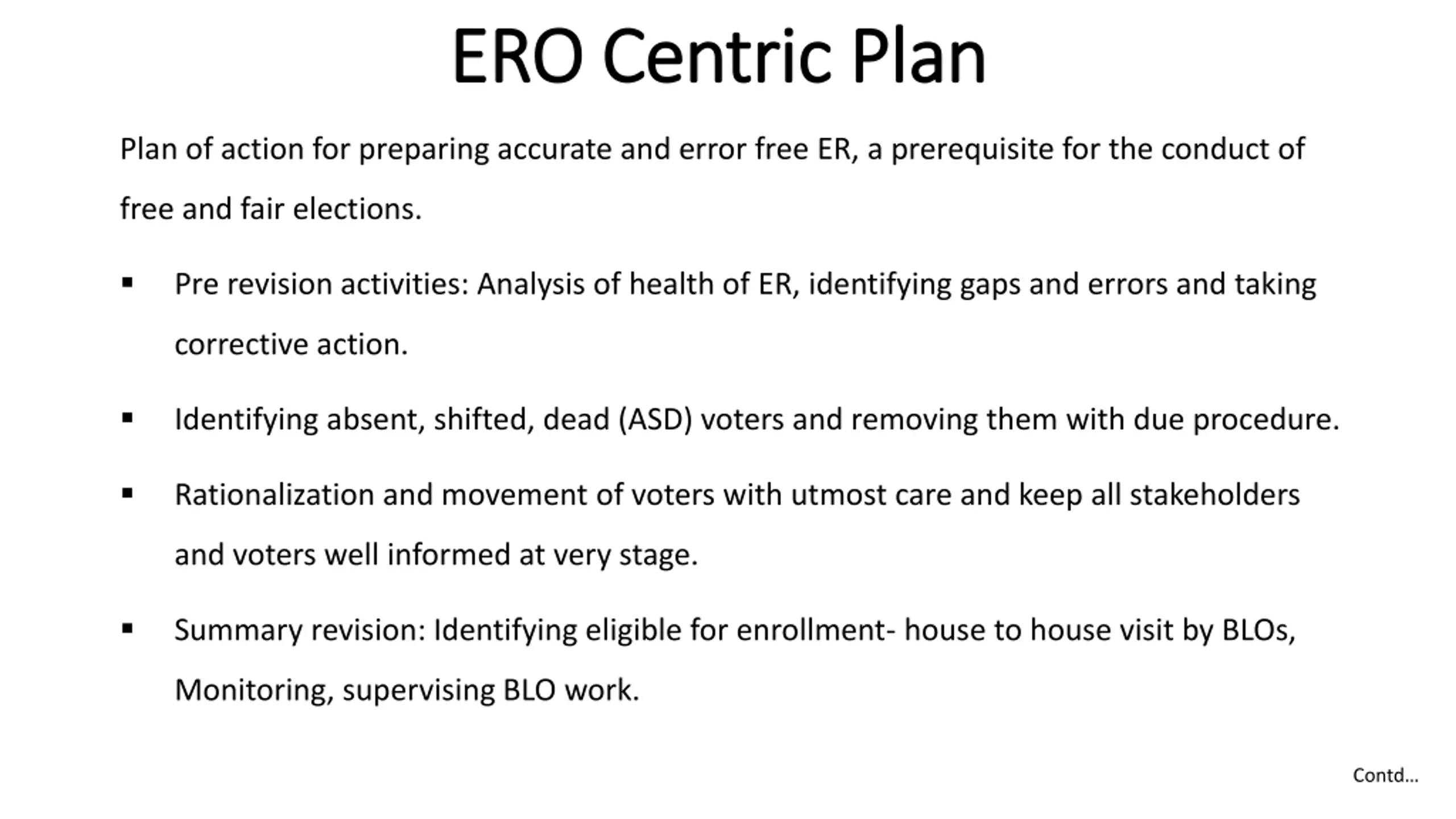 ERO Centric Plan ERO Centric Plan Plan of action for preparing accurate and error free ER, a prerequisite for the conduct of free and fair elections. Pre revision activities: Analysis of health of ER, identifying gaps and errors and taking corrective action. Identifying absent, shifted, dead (ASD) voters and removing them with due procedure. Rationalization and movement of voters with utmost care and keep all stakeholders and voters well informed at very stage. Summary revision: Identifying eligible for enrollment- house to house visit by BLOs, Monitoring, supervising BLO work. Contd