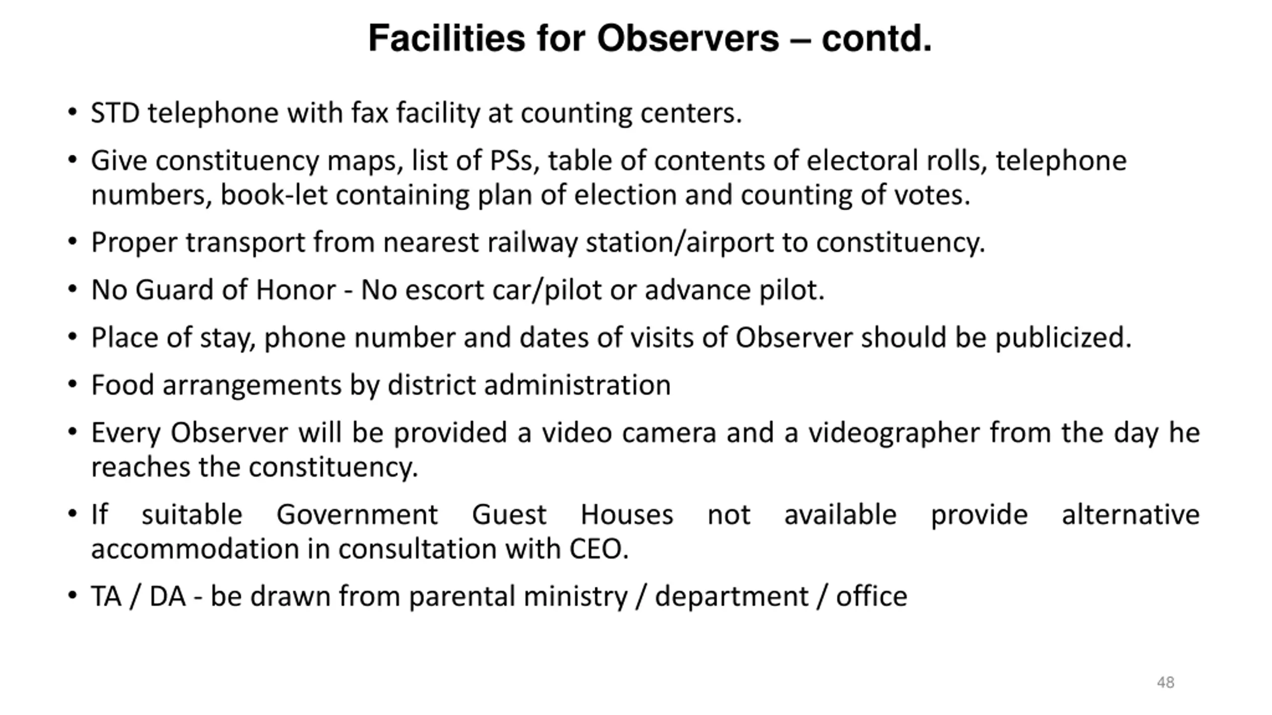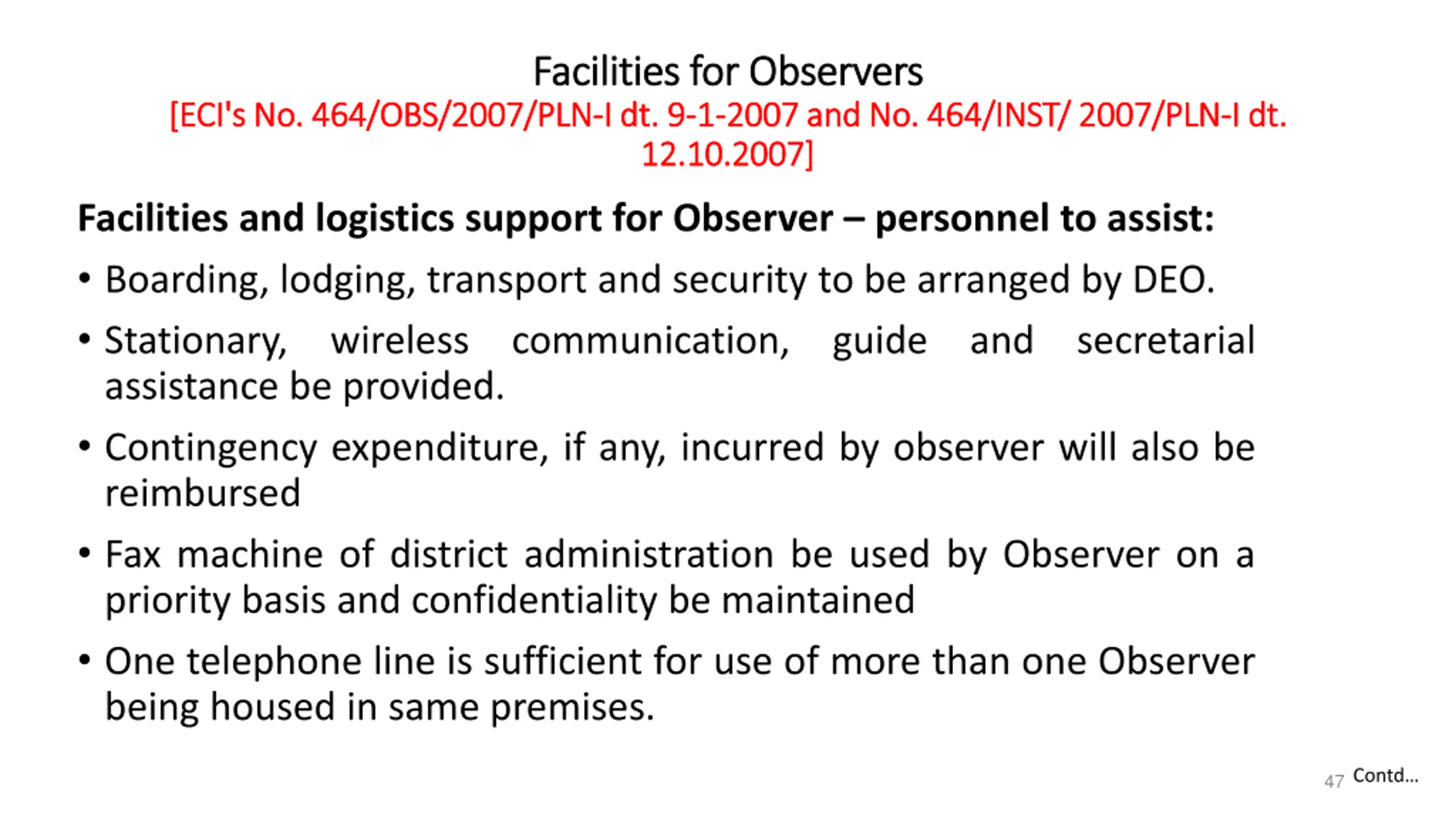 Facilities for Observers Facilities for Observers I dt. 9- -1 1- -2007 and No. 464/INST/ 2007/PLN 2007 and No. 464/INST/ 2007/PLN- -I dt. 12.10.2007] 12.10.2007] [ECI's No. 464/OBS/2007/PLN [ECI's No. 464/OBS/2007/PLN- -I dt. 9 I dt. Facilities and logistics support for Observer personnel to assist: Boarding, lodging, transport and security to be arranged by DEO. Stationary, wireless communication, guide and secretarial assistance be provided. Contingency expenditure, if any, incurred by observer will also be reimbursed Fax machine of district administration be used by Observer on a priority basis and confidentiality be maintained One telephone line is sufficient for use of more than one Observer being housed in same premises. 47Contd