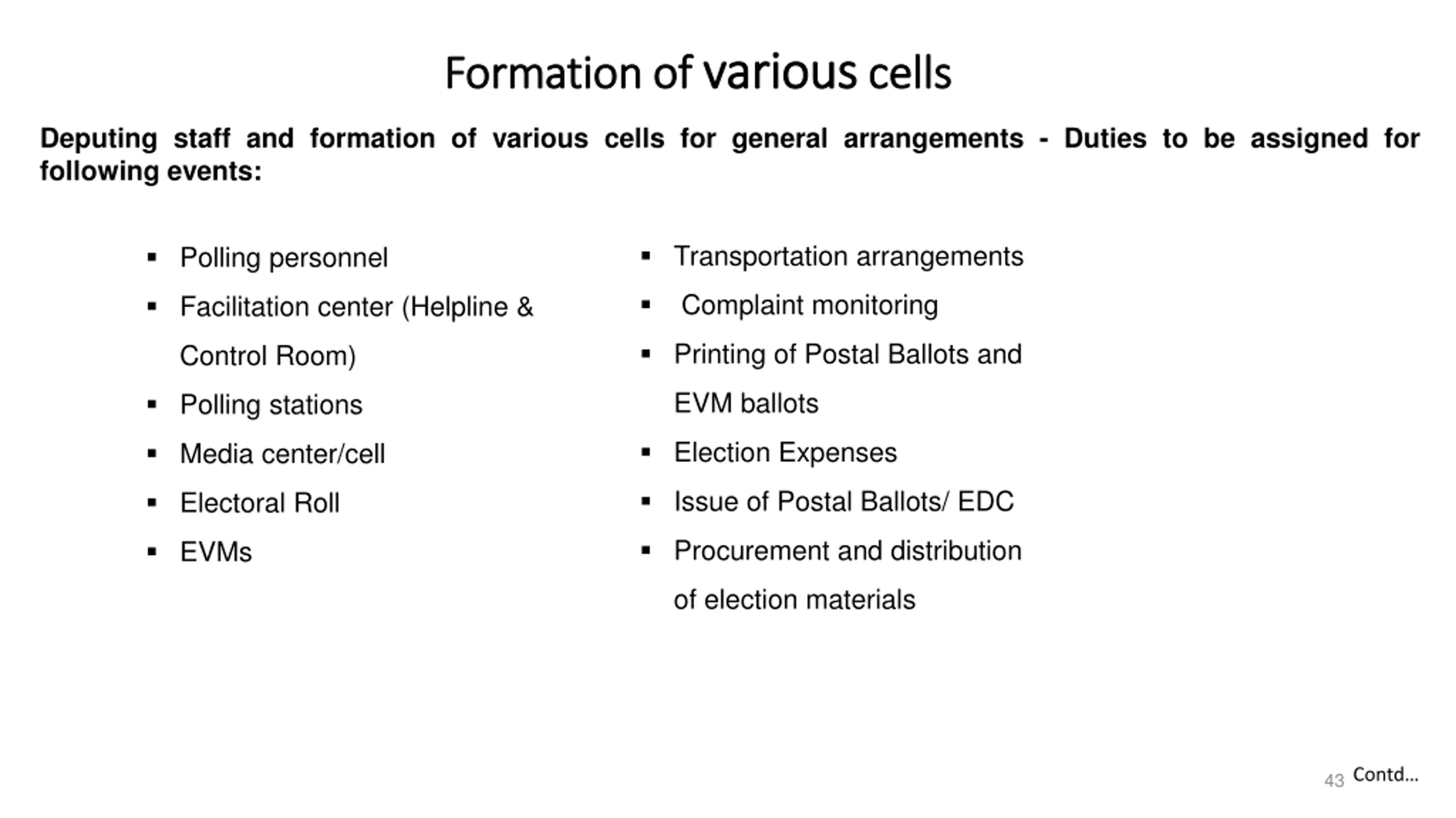 Formation of Formation of various various cells cells Deputing staff and formation of various cells for general arrangements - Duties to be assigned for following events: Transportation arrangements Polling personnel Complaint monitoring Facilitation center (Helpline & Printing of Postal Ballots and Control Room) EVM ballots Polling stations Election Expenses Media center/cell Issue of Postal Ballots/ EDC Electoral Roll Procurement and distribution EVMs of election materials Contd 43