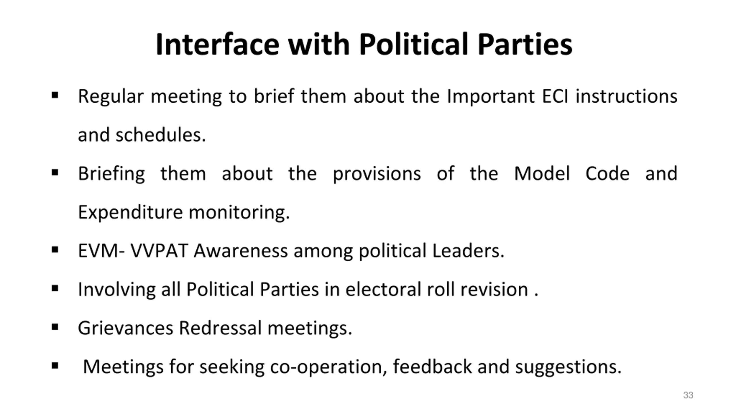 Interface with Political Parties Regular meeting to brief them about the Important ECI instructions and schedules. Briefing them about the provisions of the Model Code and Expenditure monitoring. EVM- VVPAT Awareness among political Leaders. Involving all Political Parties in electoral roll revision . Grievances Redressal meetings. Meetings for seeking co-operation, feedback and suggestions. 33
