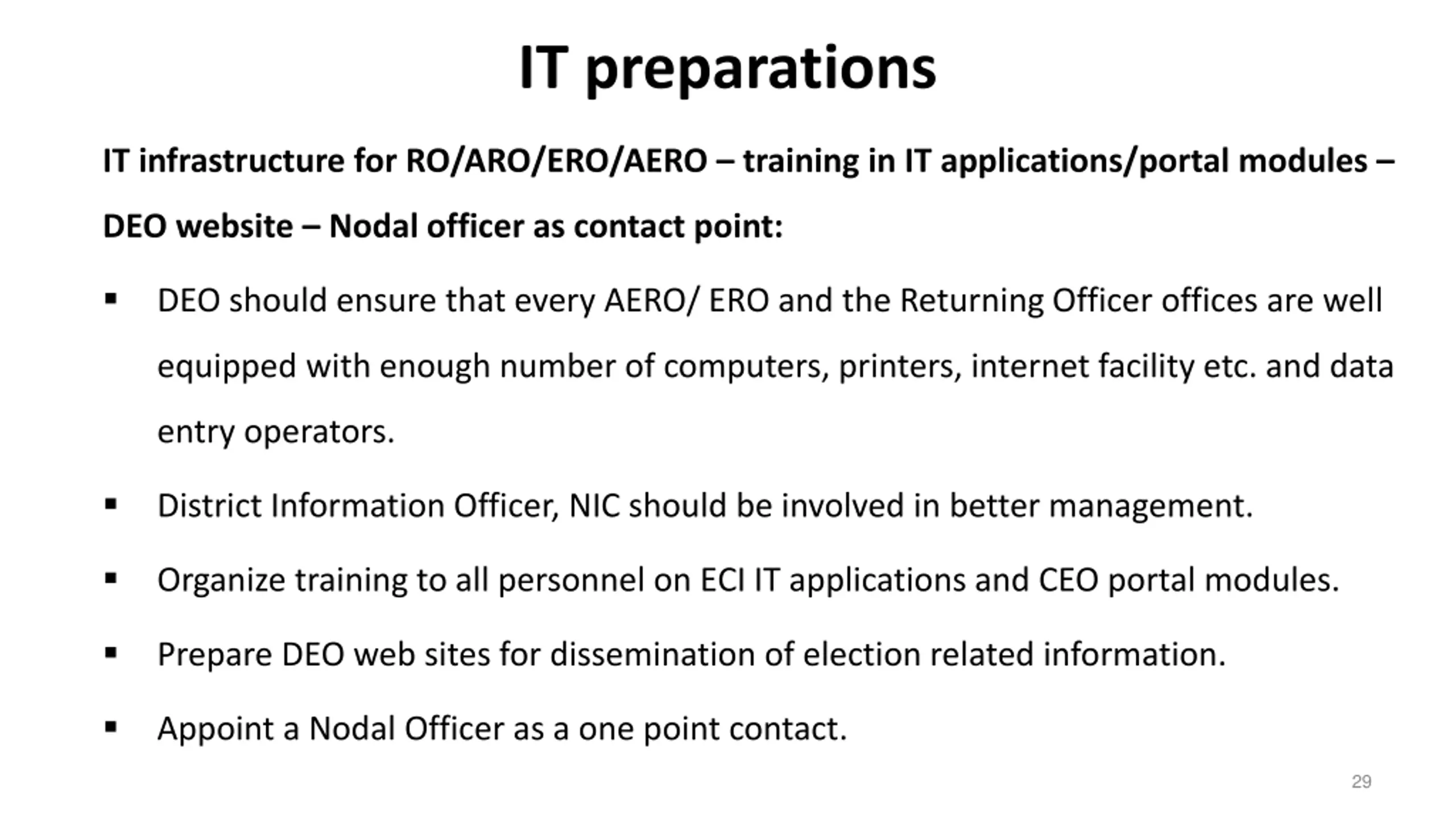 IT preparations IT infrastructure for RO/ARO/ERO/AERO training in IT applications/portal modules DEO website Nodal officer as contact point: DEO should ensure that every AERO/ ERO and the Returning Officer offices are well equipped with enough number of computers, printers, internet facility etc. and data entry operators. District Information Officer, NIC should be involved in better management. Organize training to all personnel on ECI IT applications and CEO portal modules. Prepare DEO web sites for dissemination of election related information. Appoint a Nodal Officer as a one point contact. 29