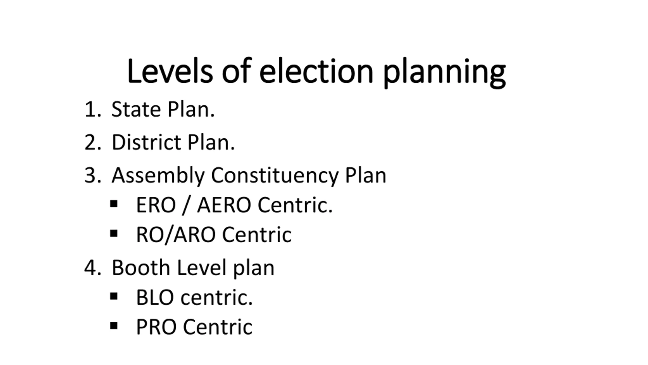 Levels of election planning Levels of election planning 1. State Plan. 2. District Plan. 3. Assembly Constituency Plan ERO / AERO Centric. RO/ARO Centric 4. Booth Level plan BLO centric. PRO Centric