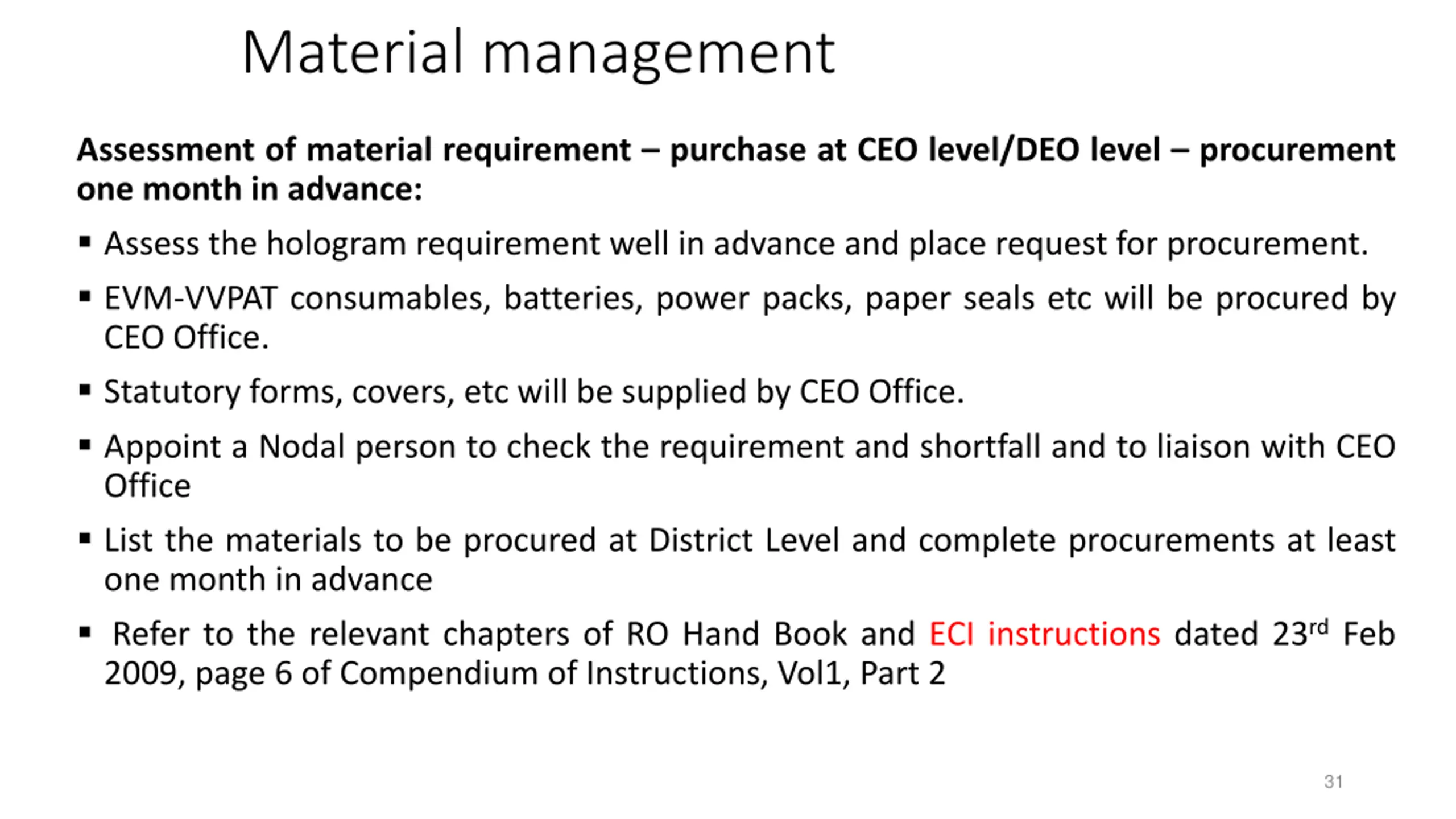 Material management Assessment of material requirement purchase at CEO level/DEO level procurement one month in advance: Assess the hologram requirement well in advance and place request for procurement. EVM-VVPAT consumables, batteries, power packs, paper seals etc will be procured by CEO Office. Statutory forms, covers, etc will be supplied by CEO Office. Appoint a Nodal person to check the requirement and shortfall and to liaison with CEO Office List the materials to be procured at District Level and complete procurements at least one month in advance Refer to the relevant chapters of RO Hand Book and ECI instructions dated 23rd Feb 2009, page 6 of Compendium of Instructions, Vol1, Part 2 31