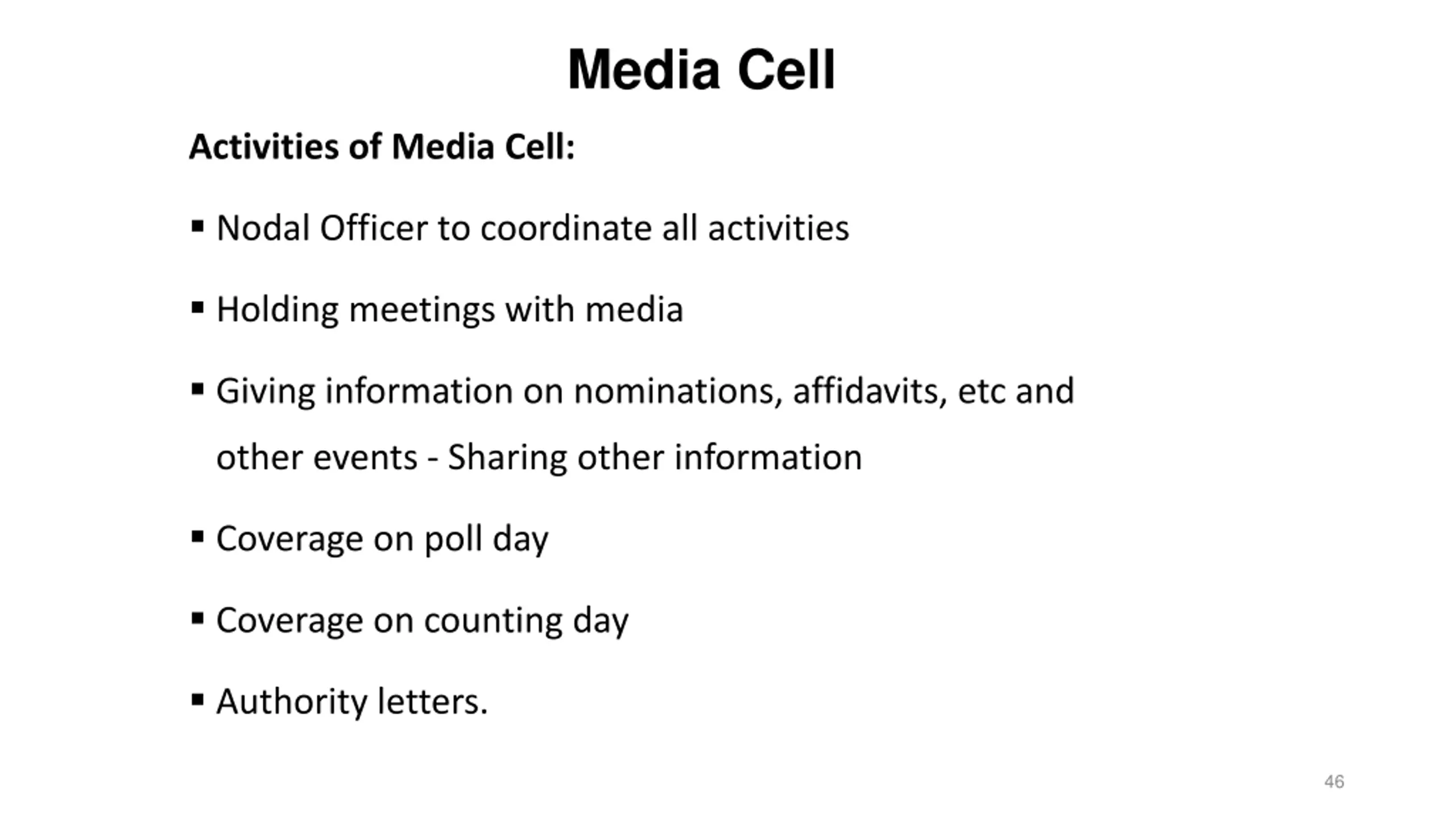 Media Cell Activities of Media Cell: Nodal Officer to coordinate all activities Holding meetings with media Giving information on nominations, affidavits, etc and other events - Sharing other information Coverage on poll day Coverage on counting day Authority letters. 46