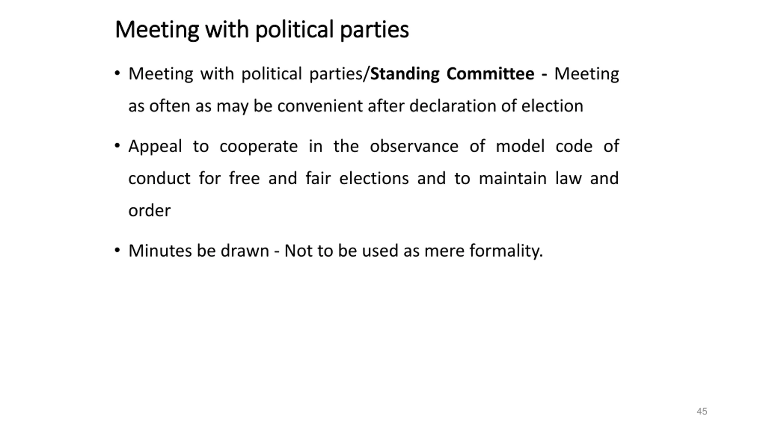 Meeting with political parties Meeting with political parties Meeting with political parties/Standing Committee - Meeting as often as may be convenient after declaration of election Appeal to cooperate in the observance of model code of conduct for free and fair elections and to maintain law and order Minutes be drawn - Not to be used as mere formality. 45