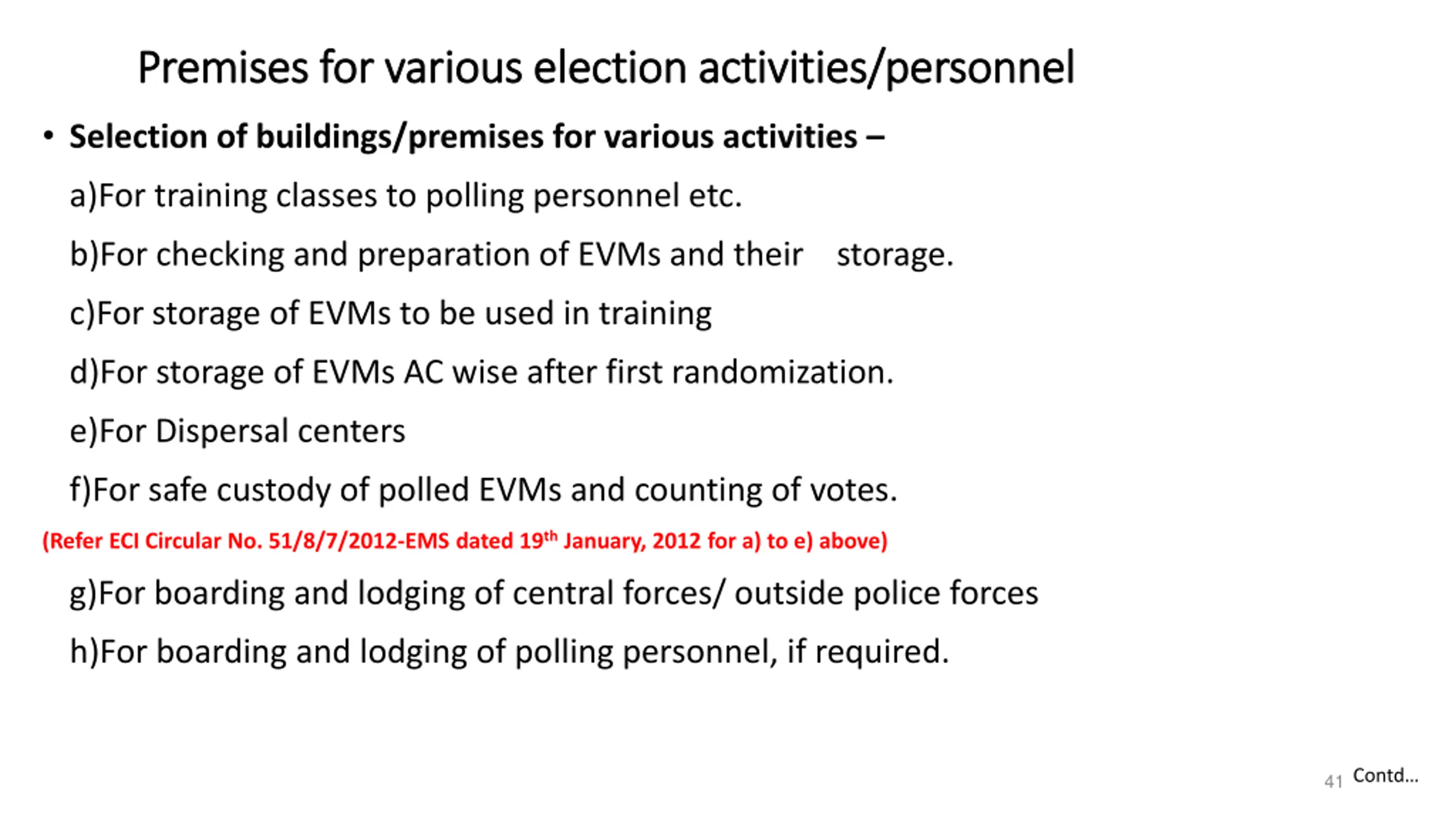 Premises for various election activities/personnel Premises for various election activities/personnel Selection of buildings/premises for various activities a)For training classes to polling personnel etc. b)For checking and preparation of EVMs and their storage. c)For storage of EVMs to be used in training d)For storage of EVMs AC wise after first randomization. e)For Dispersal centers f)For safe custody of polled EVMs and counting of votes. (Refer ECI Circular No. 51/8/7/2012-EMS dated 19th January, 2012 for a) to e) above) g)For boarding and lodging of central forces/ outside police forces h)For boarding and lodging of polling personnel, if required. 41Contd
