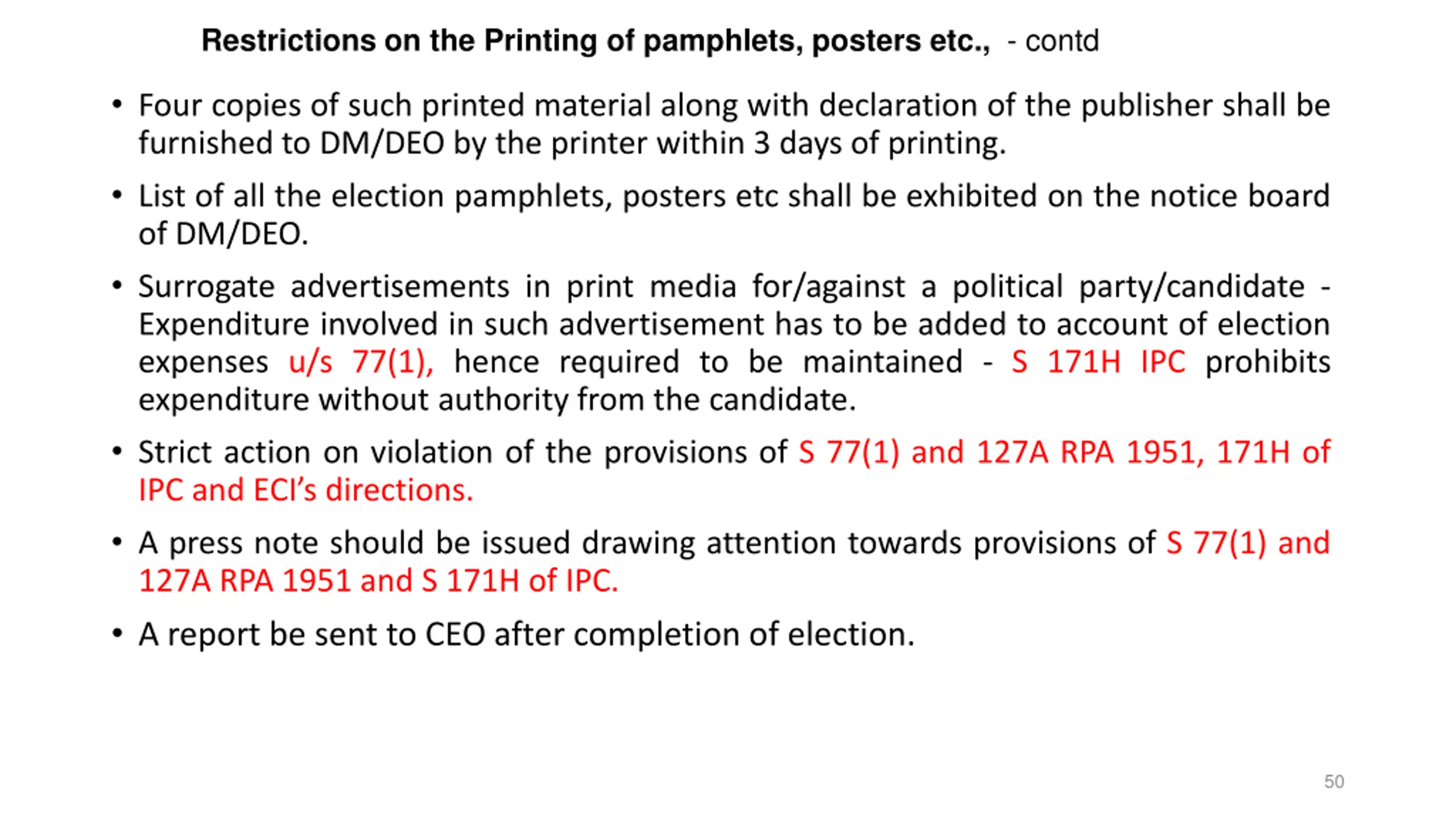 Restrictions on the Printing of pamphlets, posters etc., - contd Four copies of such printed material along with declaration of the publisher shall be furnished to DM/DEO by the printer within 3 days of printing. List of all the election pamphlets, posters etc shall be exhibited on the notice board of DM/DEO. Surrogate advertisements in print media for/against a political party/candidate - Expenditure involved in such advertisement has to be added to account of election expenses u/s 77(1), hence required to be maintained - S 171H IPC prohibits expenditure without authority from the candidate. Strict action on violation of the provisions of S 77(1) and 127A RPA 1951, 171H of IPC and ECI s directions. A press note should be issued drawing attention towards provisions of S 77(1) and 127A RPA 1951 and S 171H of IPC. A report be sent to CEO after completion of election. 50