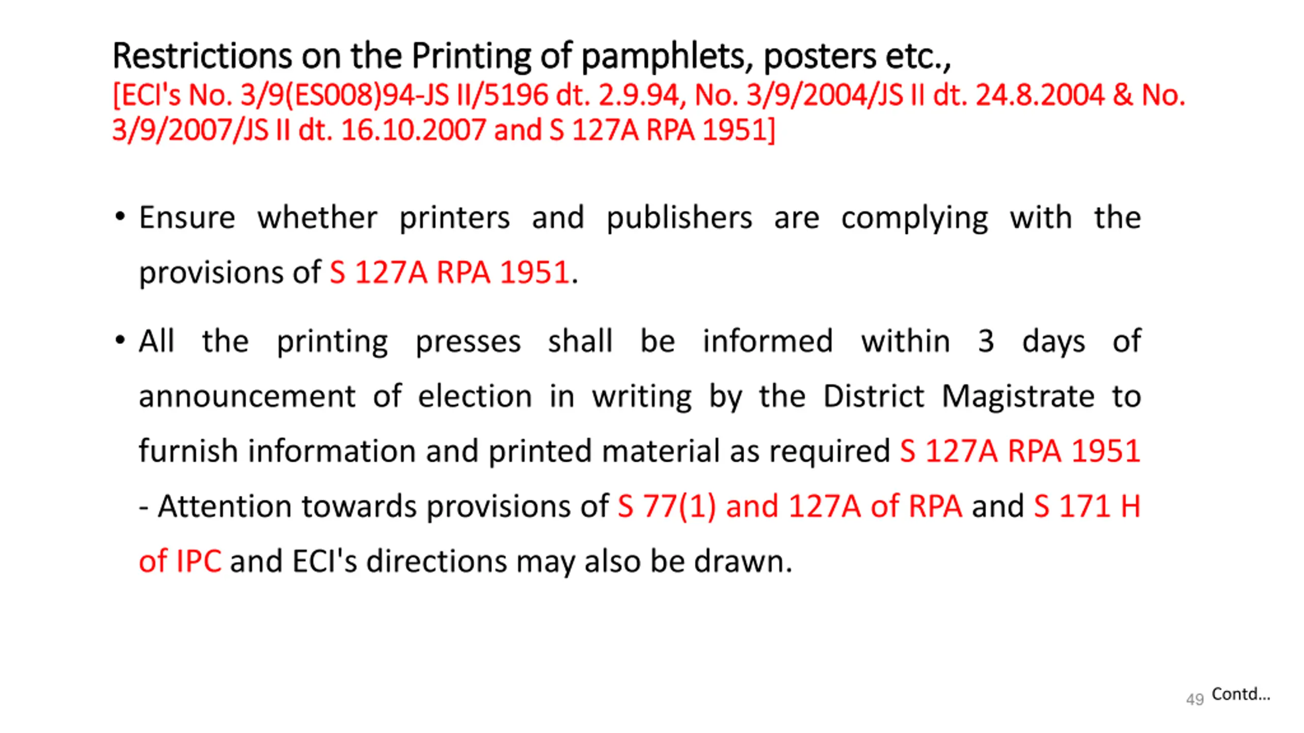Restrictions Restrictions on the Printing of pamphlets, on the Printing of pamphlets, posters [ECI's No. 3/9(ES008)94 [ECI's No. 3/9(ES008)94- -JS II/5196 dt. 2.9.94, No. 3/9/2004/JS II dt. 24.8.2004 & No. JS II/5196 dt. 2.9.94, No. 3/9/2004/JS II dt. 24.8.2004 & No. 3/9/2007/JS II dt. 16.10.2007 and 3/9/2007/JS II dt. 16.10.2007 and S S 127A 127A RPA RPA 1951] posters etc., etc., 1951] Ensure whether printers and publishers are complying with the provisions of S 127A RPA 1951. All the printing presses shall be informed within 3 days of announcement of election in writing by the District Magistrate to furnish information and printed material as required S 127A RPA 1951 - Attention towards provisions of S 77(1) and 127A of RPA and S 171 H of IPC and ECI's directions may also be drawn. 49Contd