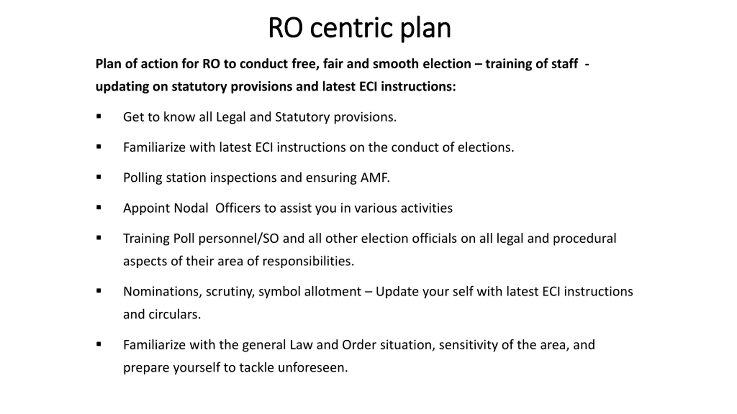 RO centric plan RO centric plan Plan of action for RO to conduct free, fair and smooth election training of staff - updating on statutory provisions and latest ECI instructions: Get to know all Legal and Statutory provisions. Familiarize with latest ECI instructions on the conduct of elections. Polling station inspections and ensuring AMF. Appoint Nodal Officers to assist you in various activities Training Poll personnel/SO and all other election officials on all legal and procedural aspects of their area of responsibilities. Nominations, scrutiny, symbol allotment Update your self with latest ECI instructions and circulars. Familiarize with the general Law and Order situation, sensitivity of the area, and prepare yourself to tackle unforeseen.