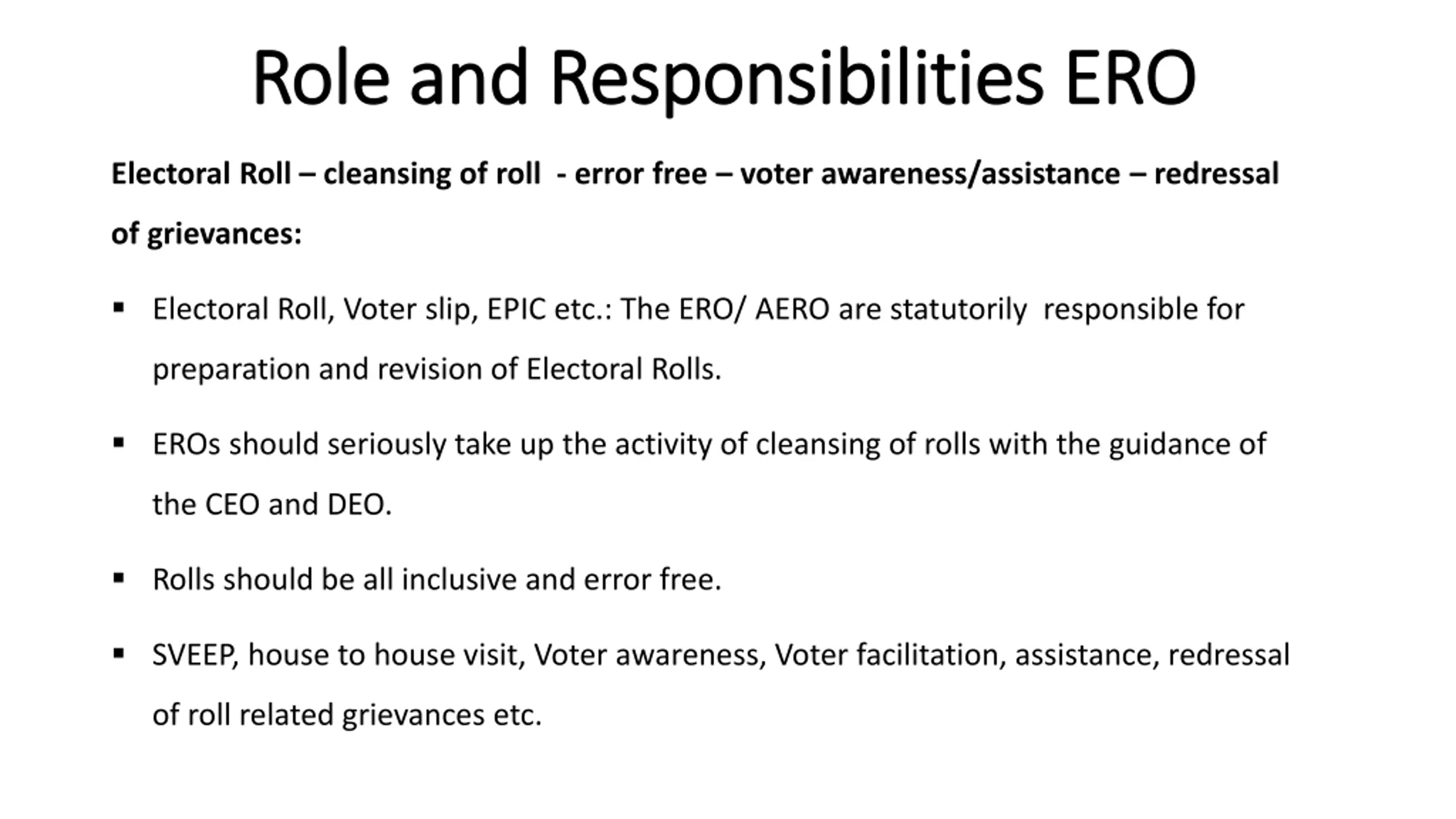 Role and Responsibilities ERO Role and Responsibilities ERO Electoral Roll cleansing of roll - error free voter awareness/assistance redressal of grievances: Electoral Roll, Voter slip, EPIC etc.: The ERO/ AERO are statutorily responsible for preparation and revision of Electoral Rolls. EROs should seriously take up the activity of cleansing of rolls with the guidance of the CEO and DEO. Rolls should be all inclusive and error free. SVEEP, house to house visit, Voter awareness, Voter facilitation, assistance, redressal of roll related grievances etc.