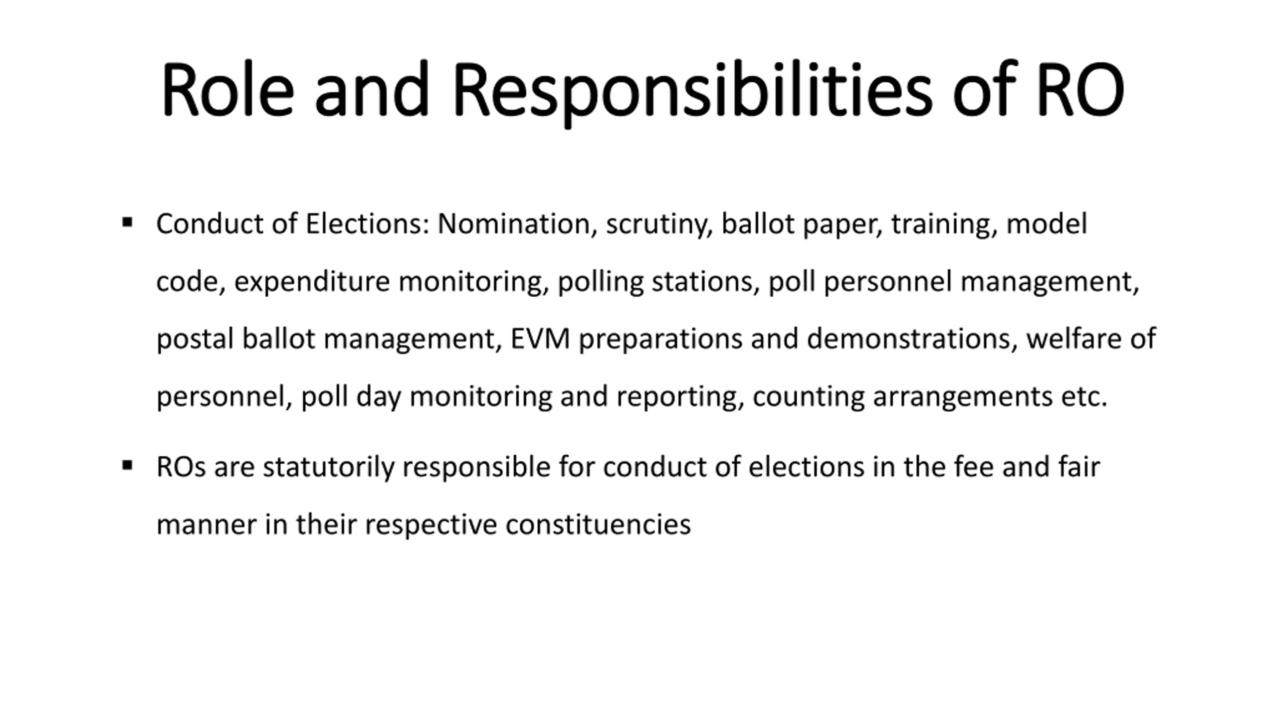 Role and Responsibilities of Role and Responsibilities of RO RO Conduct of Elections: Nomination, scrutiny, ballot paper, training, model code, expenditure monitoring, polling stations, poll personnel management, postal ballot management, EVM preparations and demonstrations, welfare of personnel, poll day monitoring and reporting, counting arrangements etc. ROs are statutorily responsible for conduct of elections in the fee and fair manner in their respective constituencies