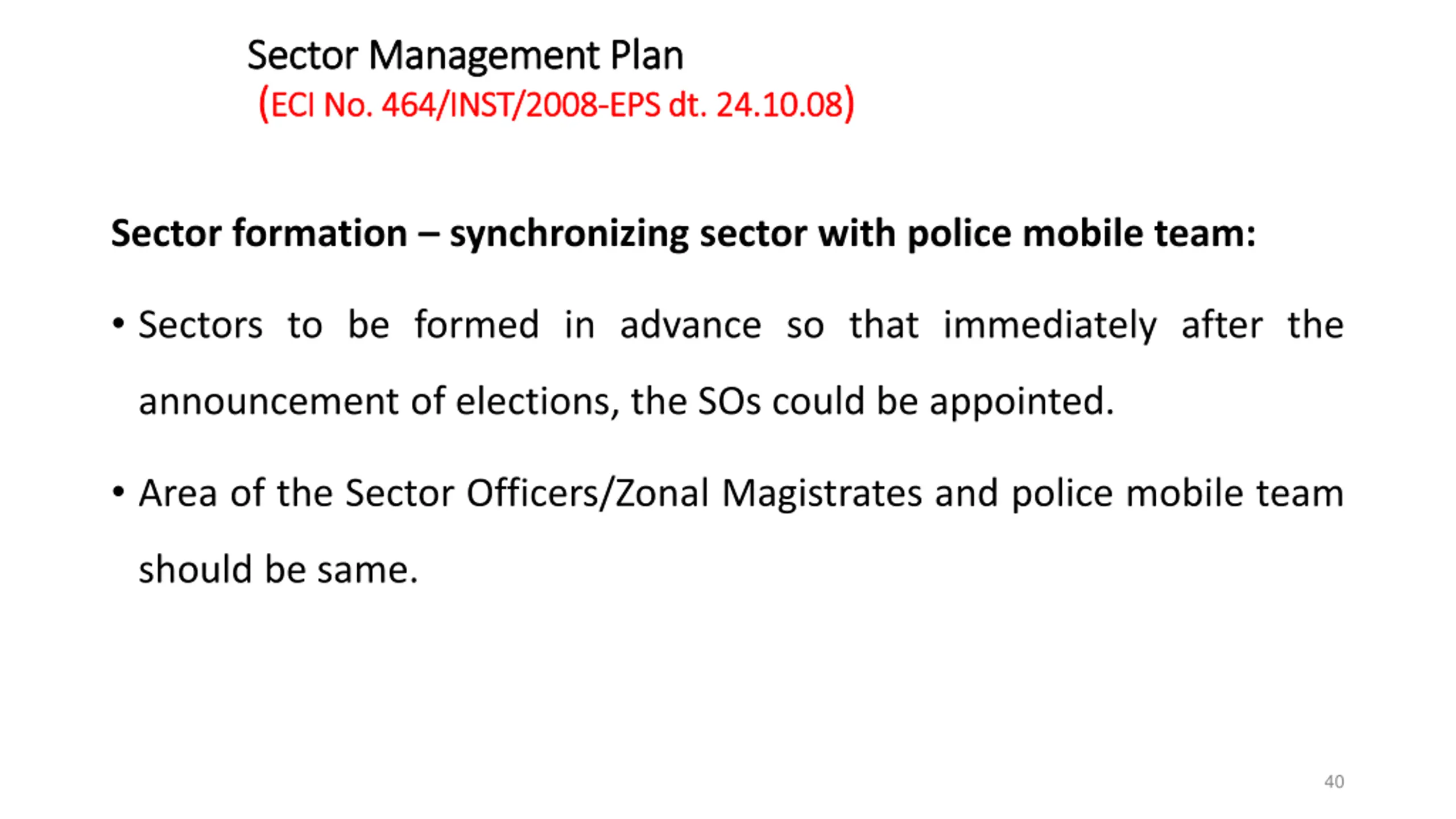 Sector Management Plan Sector Management Plan ( (ECI No. 464/INST/2008 ECI No. 464/INST/2008- -EPS dt. 24.10.08 EPS dt. 24.10.08) ) Sector formation synchronizing sector with police mobile team: Sectors to be formed in advance so that immediately after the announcement of elections, the SOs could be appointed. Area of the Sector Officers/Zonal Magistrates and police mobile team should be same. 40