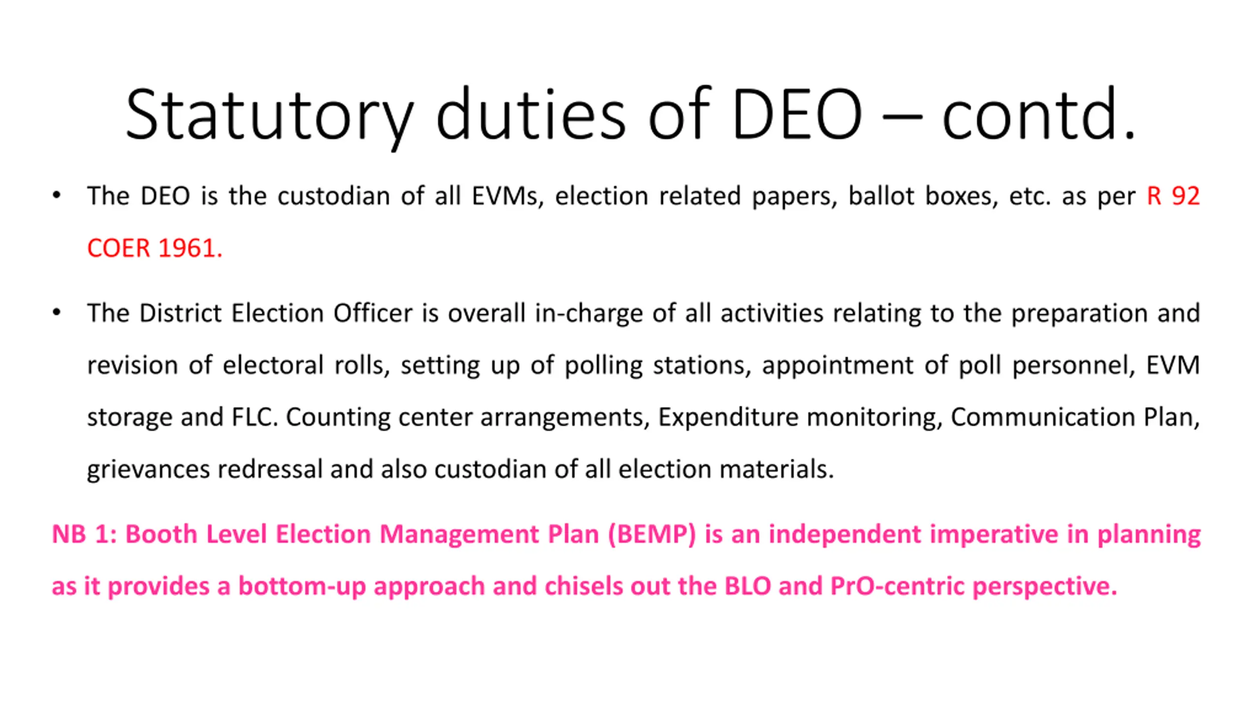 Statutory duties of DEO contd. The DEO is the custodian of all EVMs, election related papers, ballot boxes, etc. as per R 92 COER 1961. The District Election Officer is overall in-charge of all activities relating to the preparation and revision of electoral rolls, setting up of polling stations, appointment of poll personnel, EVM storage and FLC. Counting center arrangements, Expenditure monitoring, Communication Plan, grievances redressal and also custodian of all election materials. NB 1: Booth Level Election Management Plan (BEMP) is an independent imperative in planning as it provides a bottom-up approach and chisels out the BLO and PrO-centric perspective.