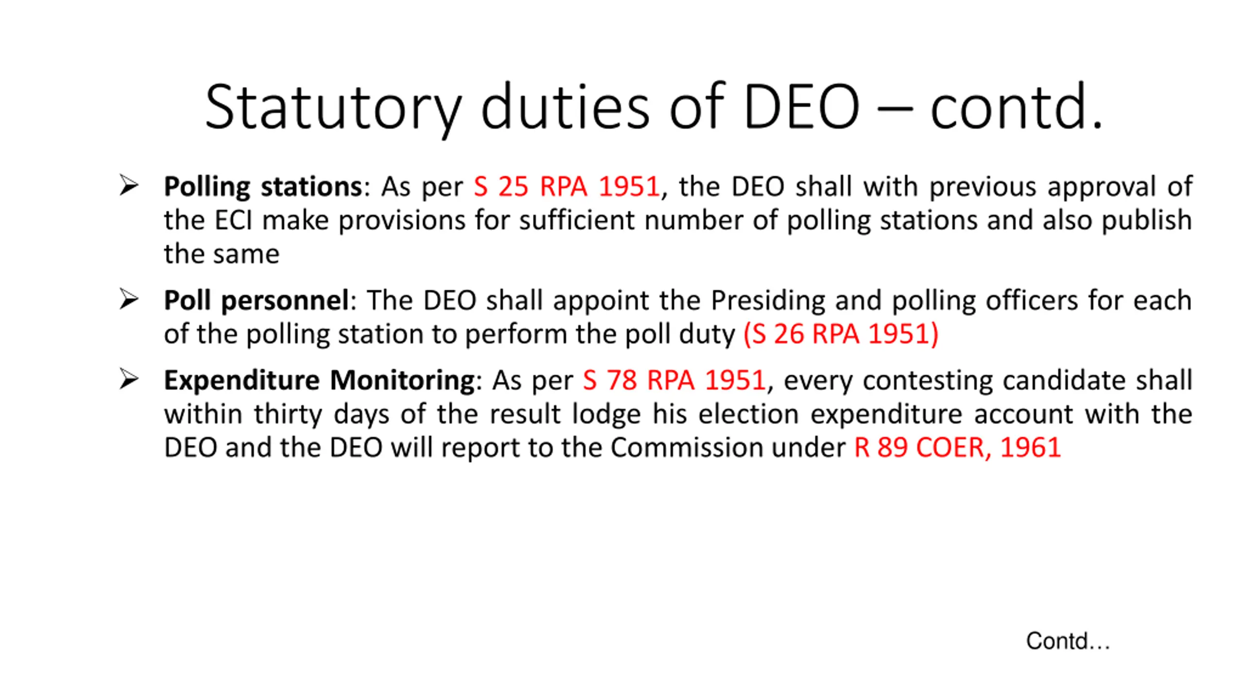 Statutory duties of DEO contd. Polling stations: As per S 25 RPA 1951, the DEO shall with previous approval of the ECI make provisions for sufficient number of polling stations and also publish the same Poll personnel: The DEO shall appoint the Presiding and polling officers for each of the polling station to perform the poll duty (S 26 RPA 1951) Expenditure Monitoring: As per S 78 RPA 1951, every contesting candidate shall within thirty days of the result lodge his election expenditure account with the DEO and the DEO will report to the Commission under R 89 COER, 1961 Contd