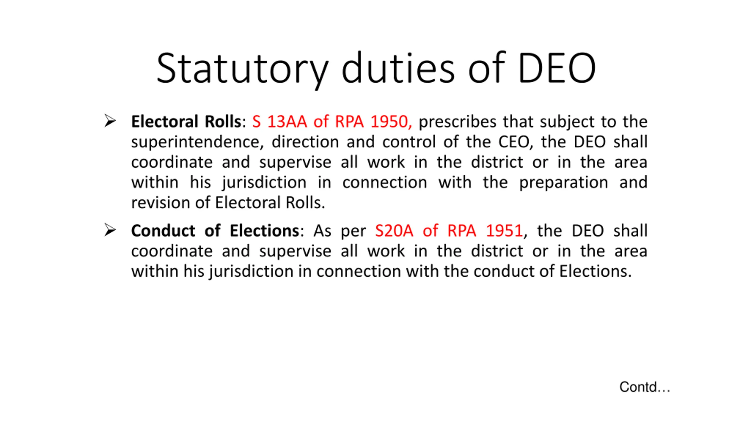 Statutory duties of DEO Electoral Rolls: S 13AA of RPA 1950, prescribes that subject to the superintendence, direction and control of the CEO, the DEO shall coordinate and supervise all work in the district or in the area within his jurisdiction in connection with the preparation and revision of Electoral Rolls. Conduct of Elections: As per S20A of RPA 1951, the DEO shall coordinate and supervise all work in the district or in the area within his jurisdiction in connection with the conduct of Elections. Contd