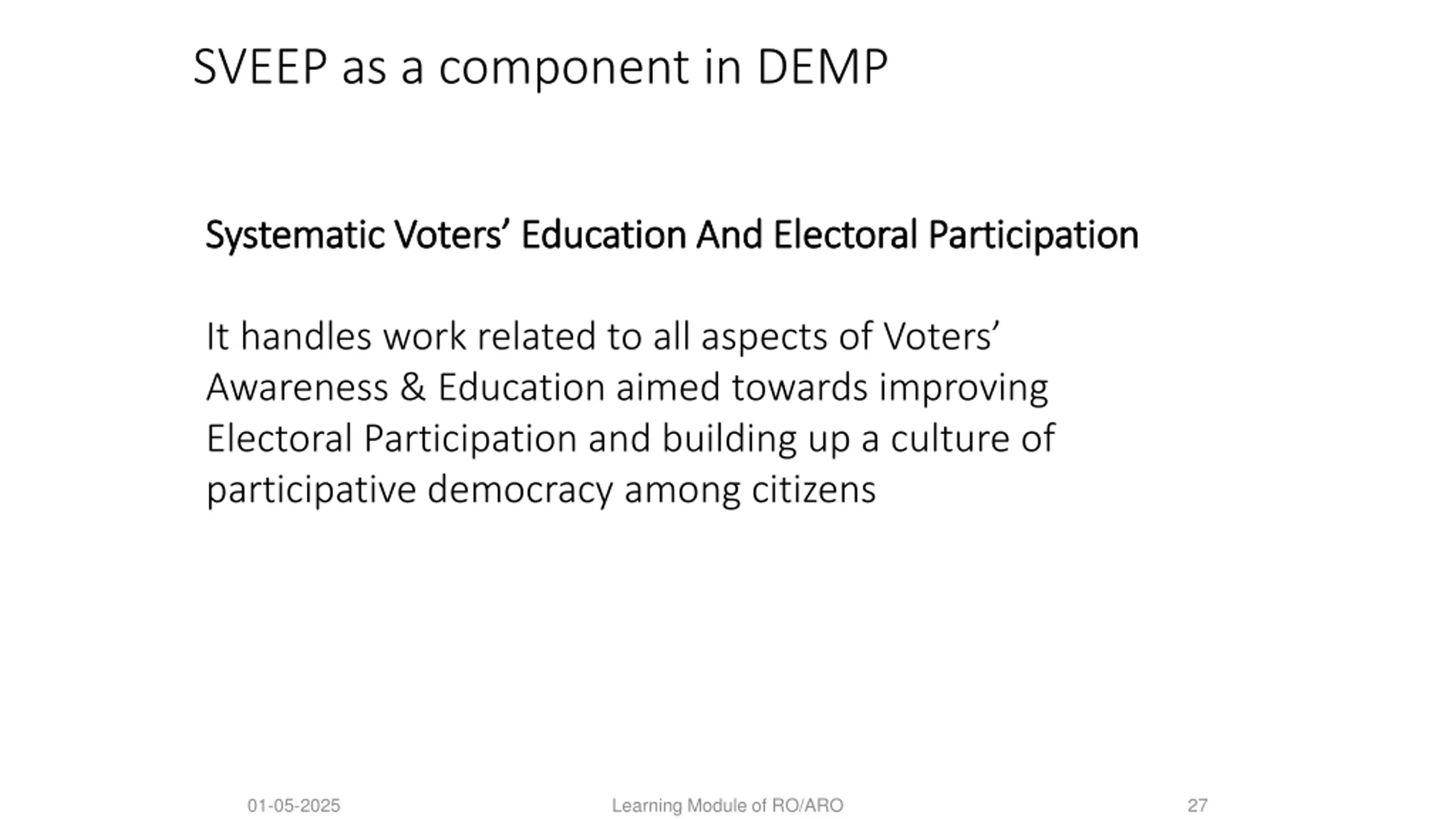 SVEEP as a component in DEMP Systematic Voters Education And Electoral Participation Systematic Voters Education And Electoral Participation It handles work related to all aspects of Voters Awareness & Education aimed towards improving Electoral Participation and building up a culture of participative democracy among citizens 01-05-2025 Learning Module of RO/ARO 27