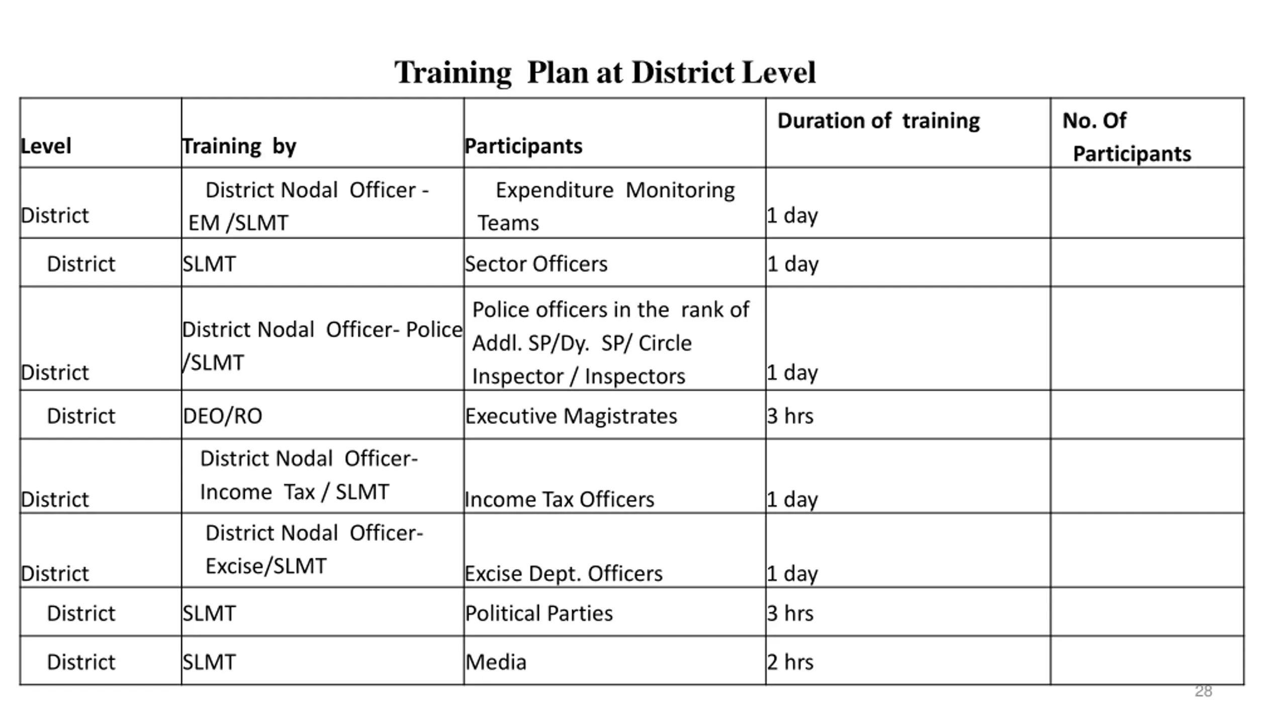Training Plan at DistrictLevel Duration of training No. Of Participants Level Training by Participants District Nodal Officer - EM /SLMT Expenditure Monitoring Teams District 1 day District SLMT Sector Officers 1 day Police officers in the rank of Addl. SP/Dy. SP/ Circle Inspector / Inspectors District Nodal Officer- Police /SLMT District 1 day District DEO/RO Executive Magistrates 3 hrs District Nodal Officer- Income Tax / SLMT District Income Tax Officers 1 day District Nodal Officer- Excise/SLMT District Excise Dept. Officers 1 day District SLMT Political Parties 3 hrs District SLMT Media 2 hrs 28