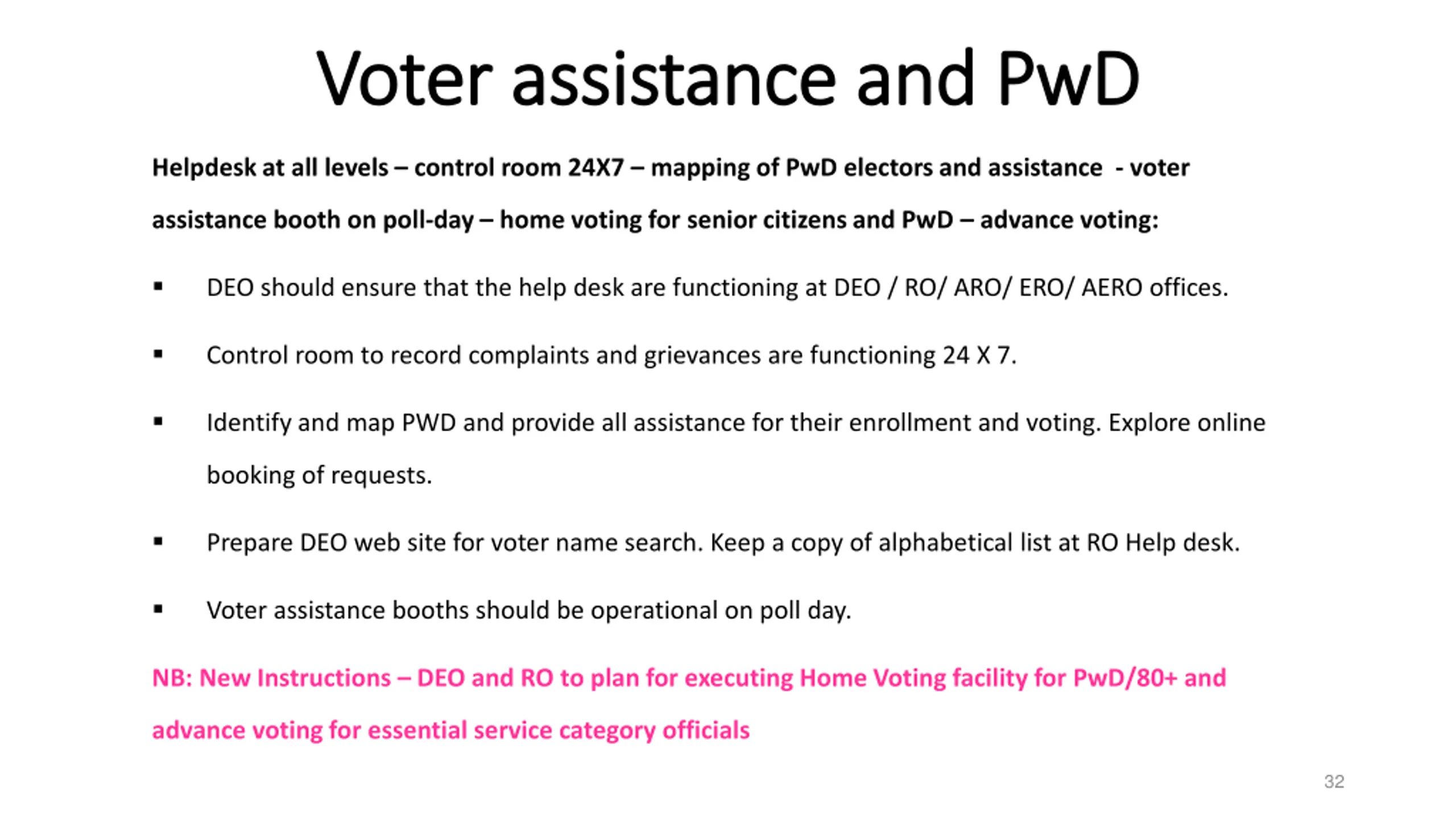 Voter assistance and PwD Voter assistance and PwD Helpdesk at all levels control room 24X7 mapping of PwD electors and assistance - voter assistance booth on poll-day home voting for senior citizens and PwD advance voting: DEO should ensure that the help desk are functioning at DEO / RO/ ARO/ ERO/ AERO offices. Control room to record complaints and grievances are functioning 24 X 7. Identify and map PWD and provide all assistance for their enrollment and voting. Explore online booking of requests. Prepare DEO web site for voter name search. Keep a copy of alphabetical list at RO Help desk. Voter assistance booths should be operational on poll day. NB: New Instructions DEO and RO to plan for executing Home Voting facility for PwD/80+ and advance voting for essential service category officials 32