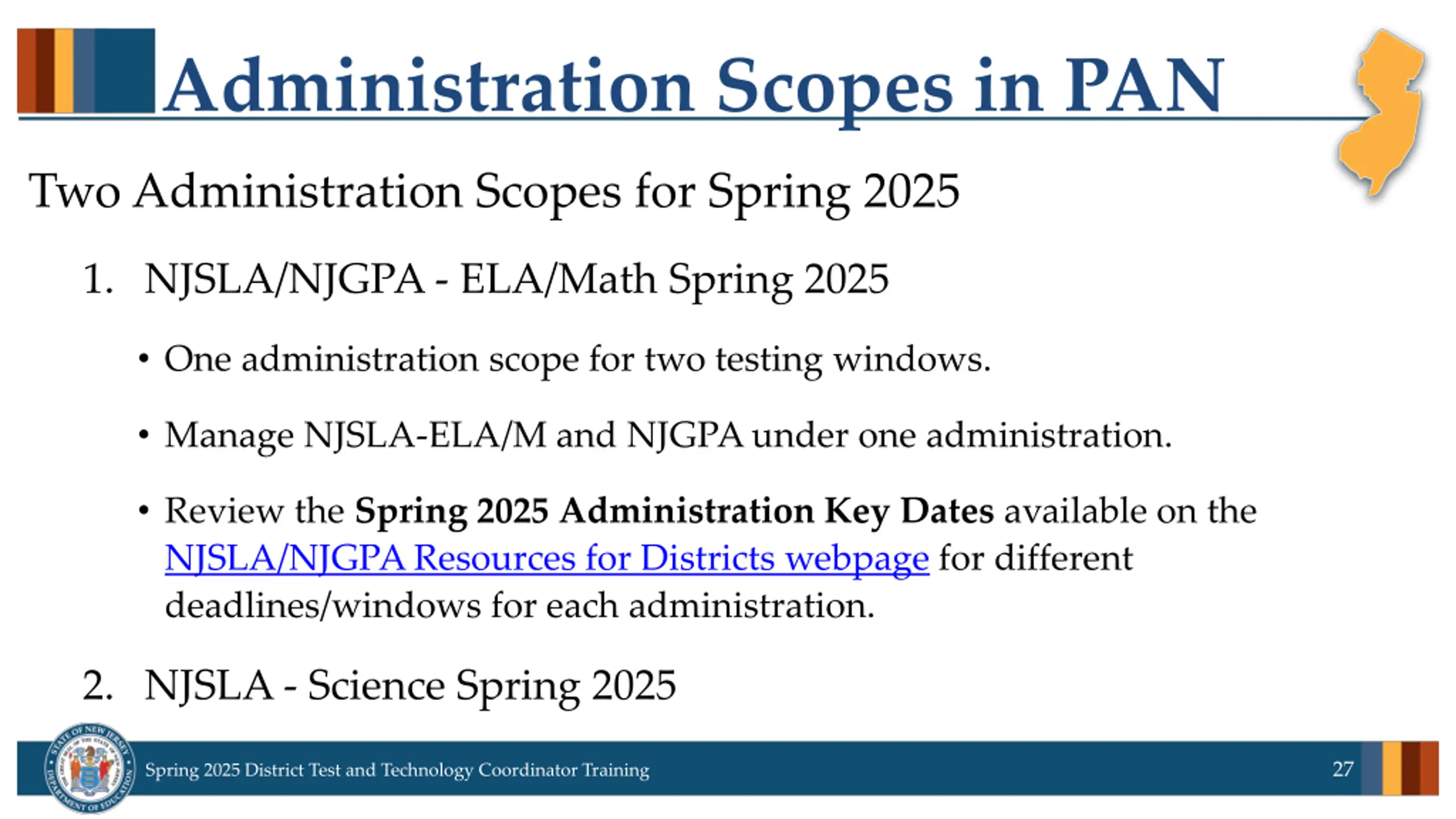 Administration Scopes in PAN Two Administration Scopes for Spring 2025 1. NJSLA/NJGPA - ELA/Math Spring 2025 One administration scope for two testing windows. Manage NJSLA-ELA/M and NJGPA under one administration. Review the Spring 2025 Administration Key Dates available on the NJSLA/NJGPA Resources for Districts webpage for different deadlines/windows for each administration. 2. NJSLA - Science Spring 2025 27 Spring 2025 District Test and Technology Coordinator Training