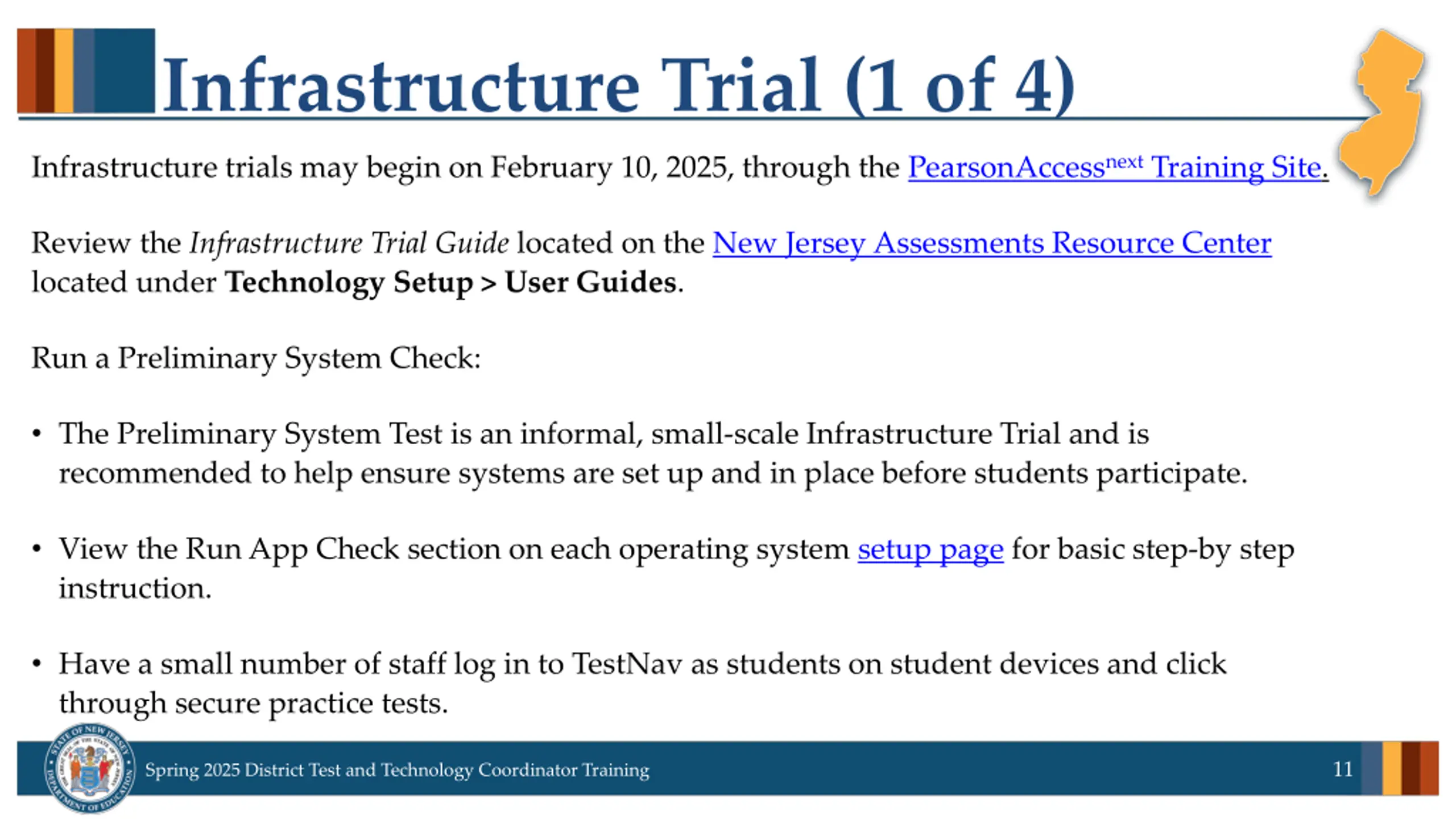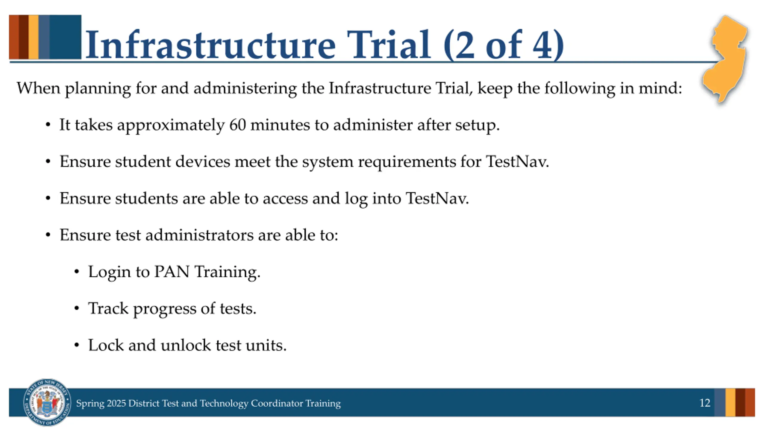 Infrastructure Trial (1 of 4) Infrastructure trials may begin on February 10, 2025, through the PearsonAccessnext Training Site. Review the Infrastructure Trial Guide located on the New Jersey Assessments Resource Center located under Technology Setup > User Guides. Run a Preliminary System Check: The Preliminary System Test is an informal, small scale Infrastructure Trial and is recommended to help ensure systems are set up and in place before students participate. View the Run App Check section on each operating system setup page for basic step-by step instruction. Have a small number of staff log in to TestNav as students on student devices and click through secure practice tests. 11 Spring 2025 District Test and Technology Coordinator Training