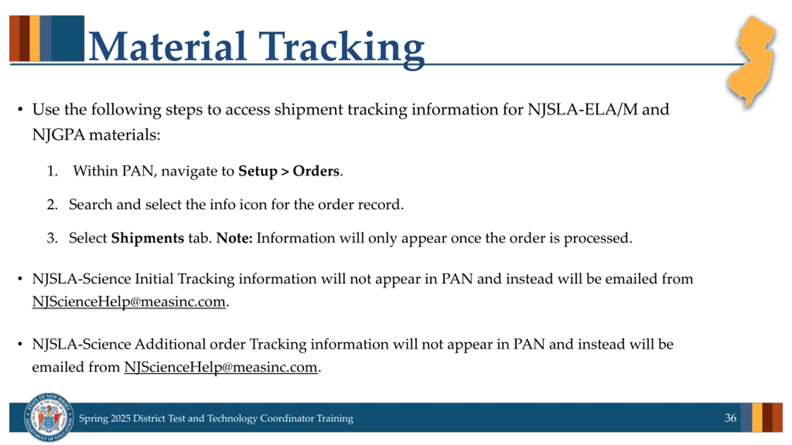 NJSLA-Science Material Tracking NJSLA-Science initial order tracking information will not appear in PAN and instead will be emailed from NJScienceHelp@measinc.com. Use the following steps to access additional order shipment tracking information for NJSLA- Science materials: 1. Within PAN, navigate to Setup > Orders. 2. Search and select the info icon for the order record. 3. On the Details & Status tab, tracking information will appear in the Customer Note field once the order is processed. 35 Spring 2025 District Test and Technology Coordinator Training