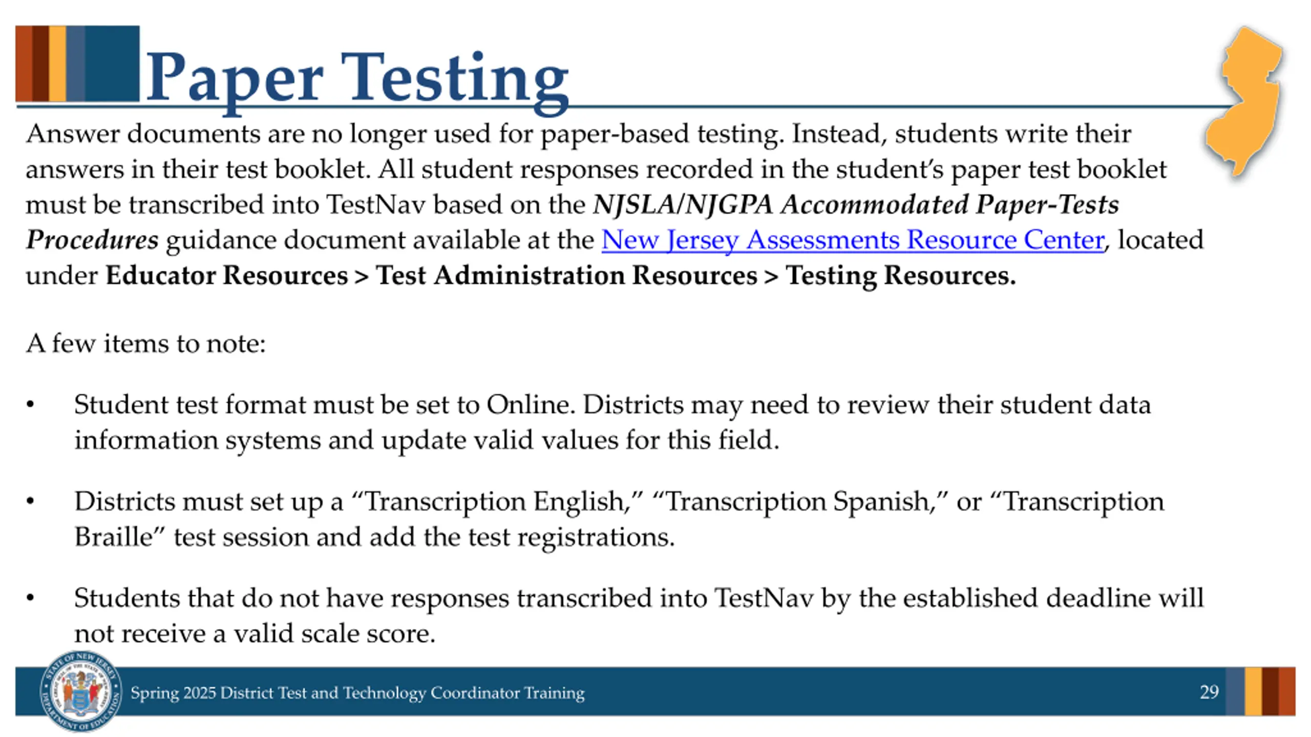 Paper Testing Answer documents are no longer used for paper-based testing. Instead, students write their answers in their test booklet. All student responses recorded in the student s paper test booklet must be transcribed into TestNav based on the NJSLA/NJGPA Accommodated Paper-Tests Procedures guidance document available at the New Jersey Assessments Resource Center, located under Educator Resources > Test Administration Resources >Testing Resources. A few items to note: Student test format must be set to Online. Districts may need to review their student data information systems and update valid values for this field. Districts must set up a Transcription English, Transcription Spanish, or Transcription Braille test session and add the test registrations. Students that do not have responses transcribed into TestNav by the established deadline will not receive a valid scale score. 29 Spring 2025 District Test and Technology Coordinator Training