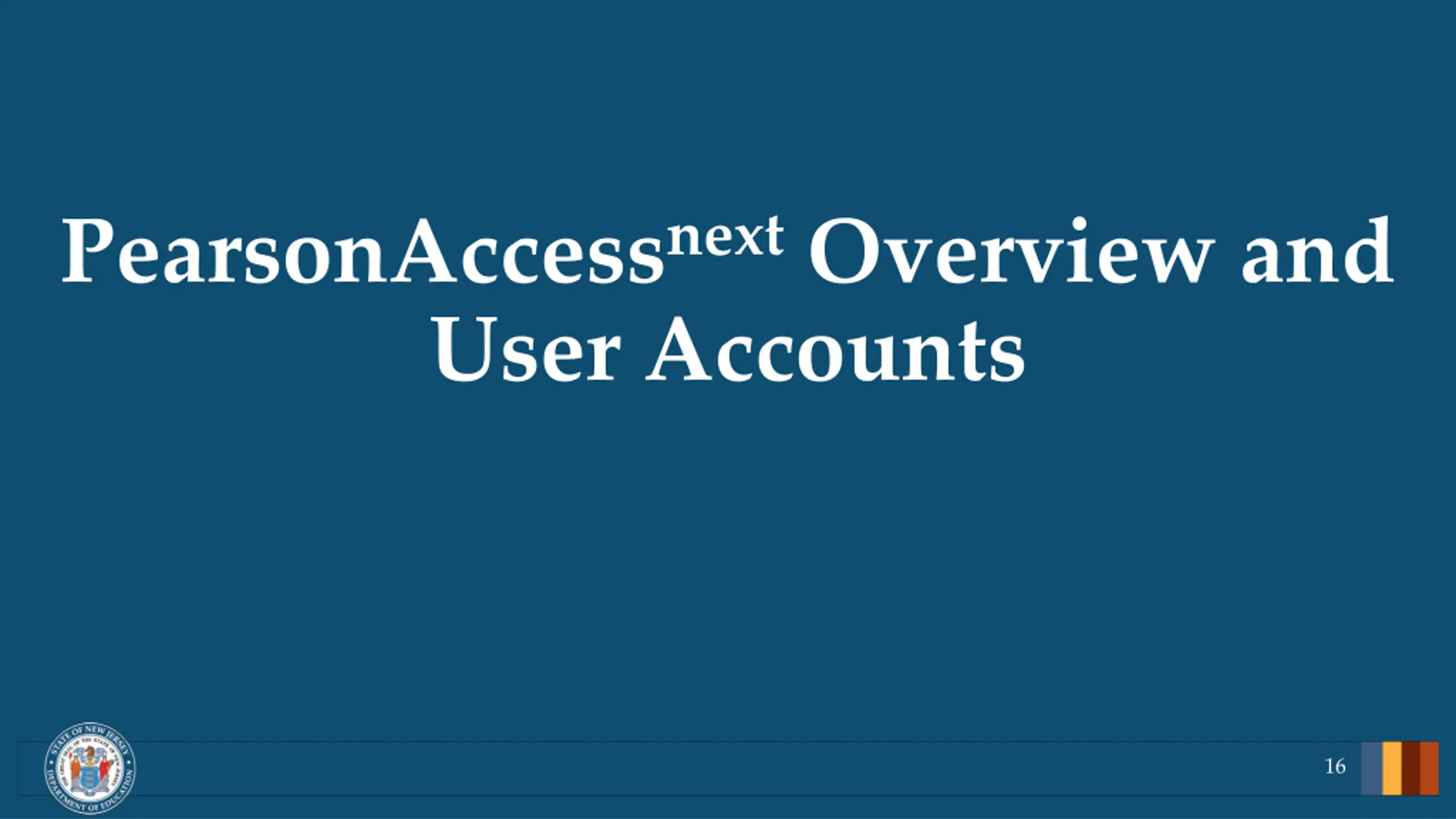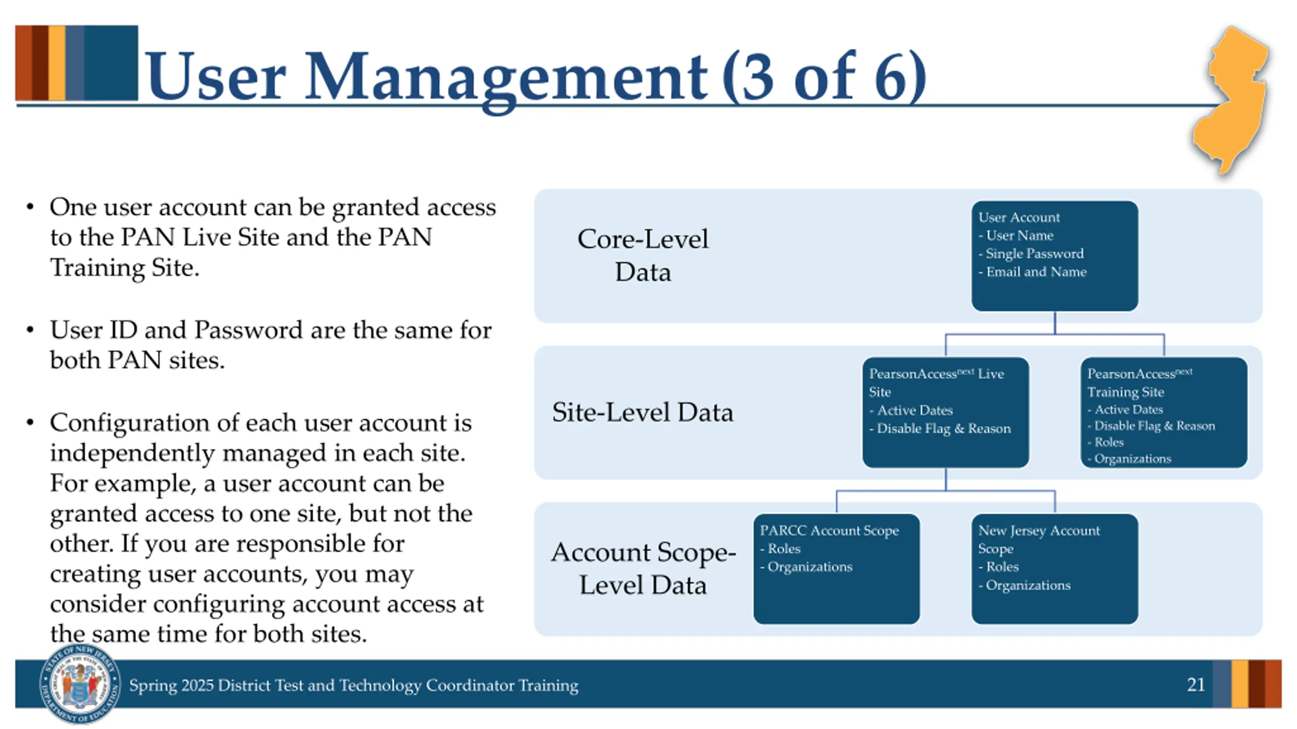 User Management(3 of 6) One user account can be granted access to the PAN Live Site and the PAN Training Site. User Account - User Name - Single Password - Email and Name Core-Level Data User ID and Password are the same for both PAN sites. PearsonAccessnext Live Site - Active Dates - Disable Flag & Reason PearsonAccessnext Training Site - Active Dates - Disable Flag & Reason - Roles - Organizations Site-Level Data Configuration of each user account is independently managed in each site. For example, a user account can be granted access to one site, but not the other. If you are responsible for creating user accounts, you may consider configuring account access at the same time for both sites. PARCC Account Scope - Roles - Organizations New Jersey Account Scope - Roles - Organizations Account Scope- Level Data 21 Spring 2025 District Test and Technology Coordinator Training