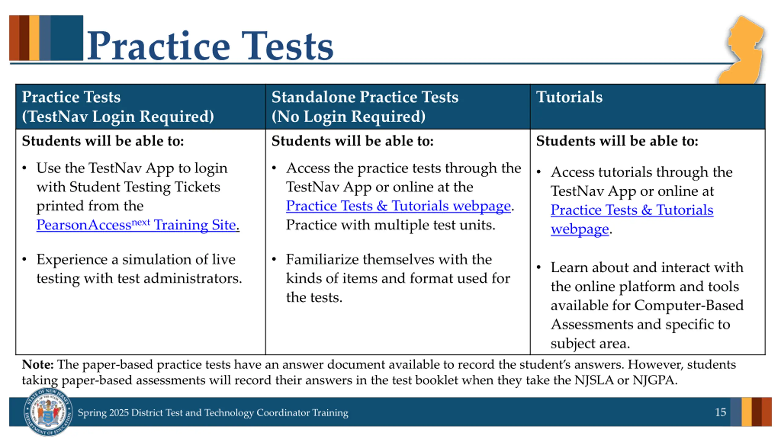 Practice Tests Practice Tests (TestNav Login Required) Standalone Practice Tests (No Login Required) Tutorials Students will be able to: Students will be able to: Students will be able to: Use the TestNav App to login with Student Testing Tickets printed from the PearsonAccessnext Training Site. Access the practice tests through the TestNav App or online at the Practice Tests & Tutorials webpage. Practice with multiple test units. Access tutorials through the TestNav App or online at Practice Tests & Tutorials webpage. Experience a simulation of live testing with test administrators. Familiarize themselves with the kinds of items and format used for the tests. Learn about and interact with the online platform and tools available for Computer-Based Assessments and specific to subject area. Note: The paper-based practice tests have an answer document available to record the student s answers. However, students taking paper-based assessments will record their answers in the test booklet when they take the NJSLA or NJGPA. 15 Spring 2025 District Test and Technology Coordinator Training