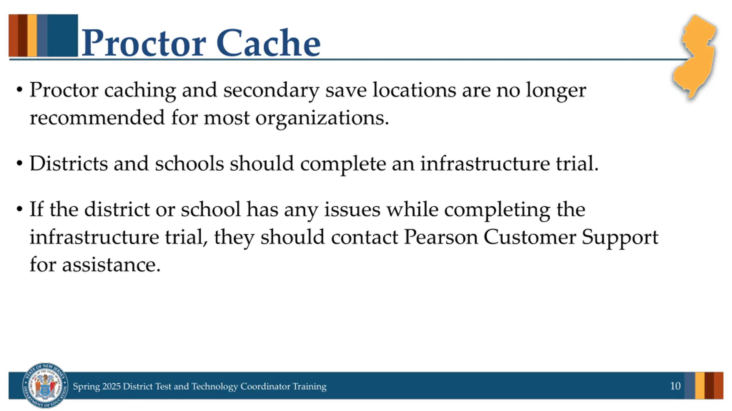 Proctor Cache Proctor caching and secondary save locations are no longer recommended for most organizations. Districts and schools should complete an infrastructure trial. If the district or school has any issues while completing the infrastructure trial, they should contact Pearson Customer Support for assistance. 10 Spring 2025 District Test and Technology Coordinator Training