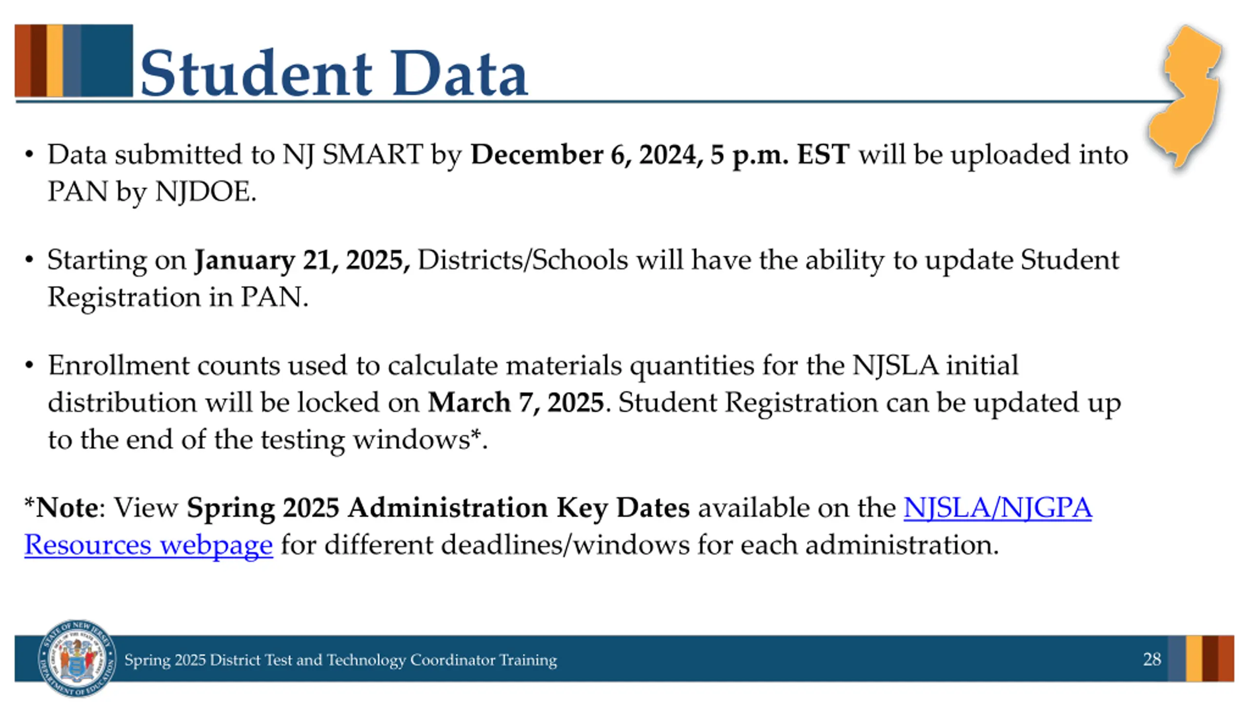 Student Data Data submitted to NJ SMART by December 6, 2024, 5 p.m. EST will be uploaded into PAN by NJDOE. Starting on January 21, 2025, Districts/Schools will have the ability to update Student Registration in PAN. Enrollment counts used to calculate materials quantities for the NJSLA initial distribution will be locked on March 7, 2025. Student Registration can be updated up to the end of the testing windows*. *Note: View Spring 2025 Administration Key Dates available on the NJSLA/NJGPA Resources webpage for different deadlines/windows for each administration. 28 Spring 2025 District Test and Technology Coordinator Training
