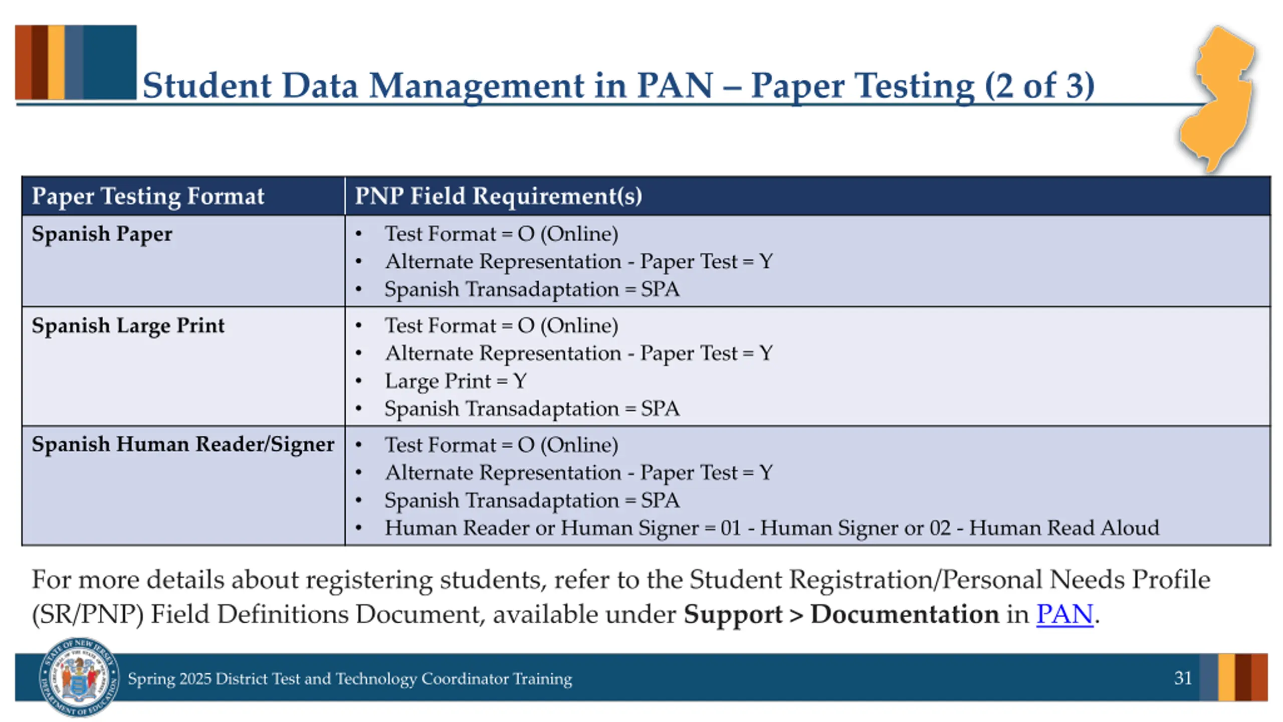 Student Data Management in PAN Paper Testing (1 of 3) Students must be registered with Test Format set as Online and the following fields populated based on the specific paper accommodation type needed. See the table below for information regarding PNP field requirements for each paper-based testing format. Paper Testing Format PNP Field Requirement(s) Test Format = O (Online) Alternate Representation - Paper Test = Y Paper Large Print Test Format = O (Online) Alternate Representation - Paper Test = Y Large Print = Y Human Reader/Signer Test Format = O (Online) Alternate Representation - Paper Test = Y Human Reader or Human Signer = 01 - Human Signer or 02 - Human Read Aloud Braille Test Format = O (Online) Alternate Representation - Paper Test = Y Braille with Tactile Graphics = Y 30 Spring 2025 District Test and Technology Coordinator Training