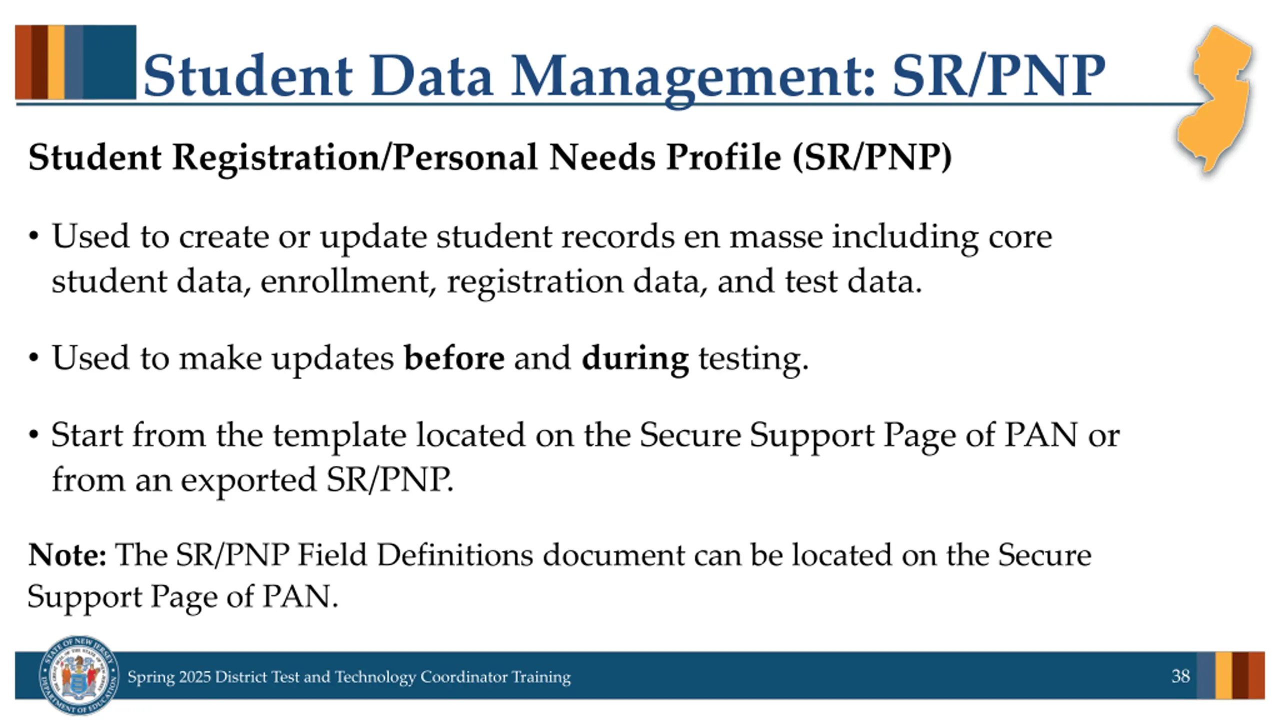 Student Data Management: SR/PNP Student Registration/Personal Needs Profile (SR/PNP) Used to create or update student records en masse including core student data, enrollment, registration data, and test data. Used to make updates before and during testing. Start from the template located on the Secure Support Page of PAN or from an exported SR/PNP. Note: The SR/PNP Field Definitions document can be located on the Secure Support Page of PAN. 38 Spring 2025 District Test and Technology Coordinator Training