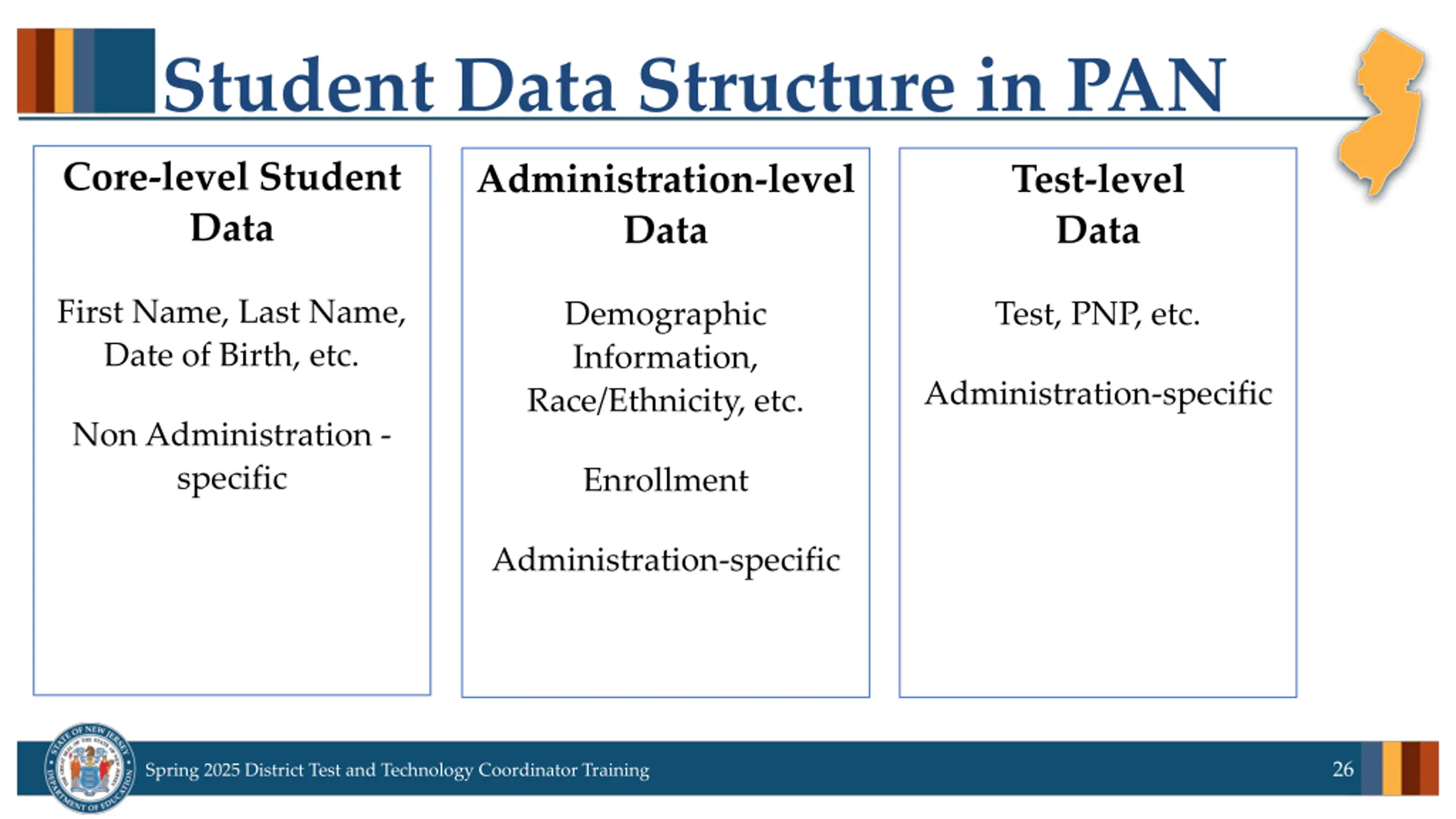 Student Data Structure in PAN Core-level Student Data Administration-level Data Test-level Data First Name, Last Name, Date of Birth, etc. Demographic Information, Race/Ethnicity, etc. Test, PNP, etc. Administration-specific Non Administration - specific Enrollment Administration-specific 26 Spring 2025 District Test and Technology Coordinator Training