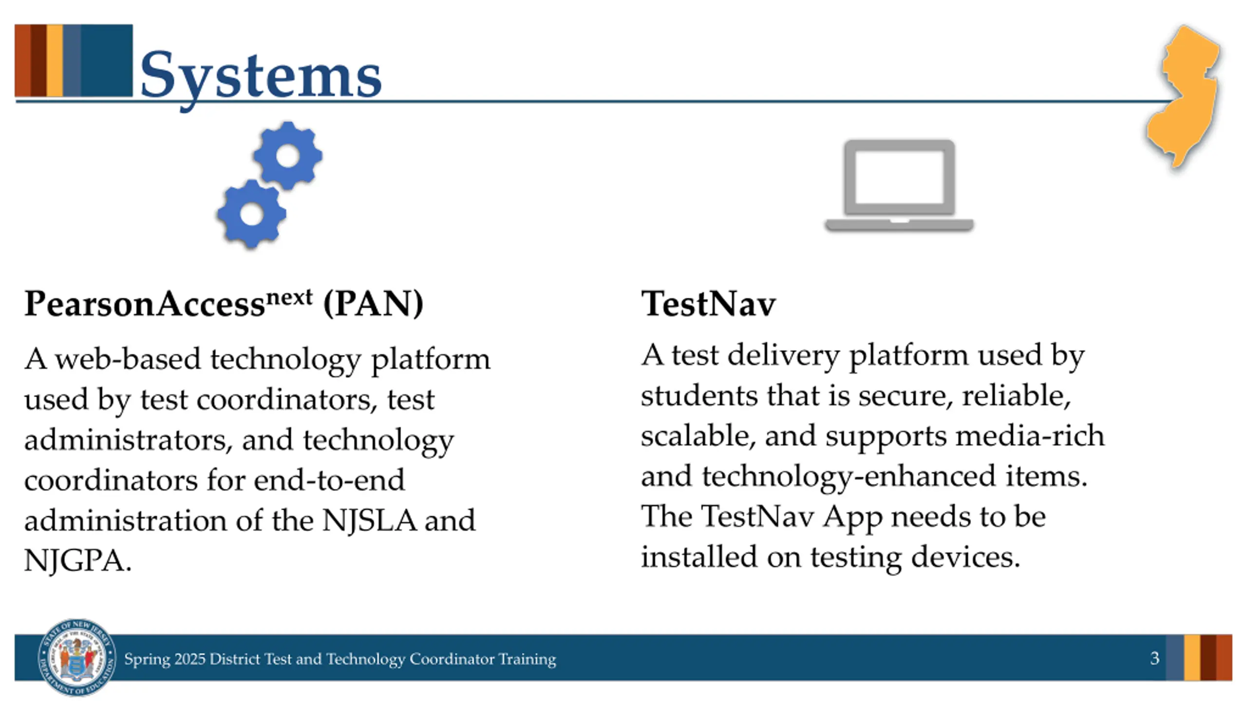 Systems PearsonAccessnext (PAN) TestNav A test delivery platform used by students that is secure, reliable, scalable, and supports media-rich and technology-enhanced items. The TestNav App needs to be installed on testing devices. A web-based technology platform used by test coordinators, test administrators, and technology coordinators for end-to-end administration of the NJSLA and NJGPA. 3 Spring 2025 District Test and Technology Coordinator Training