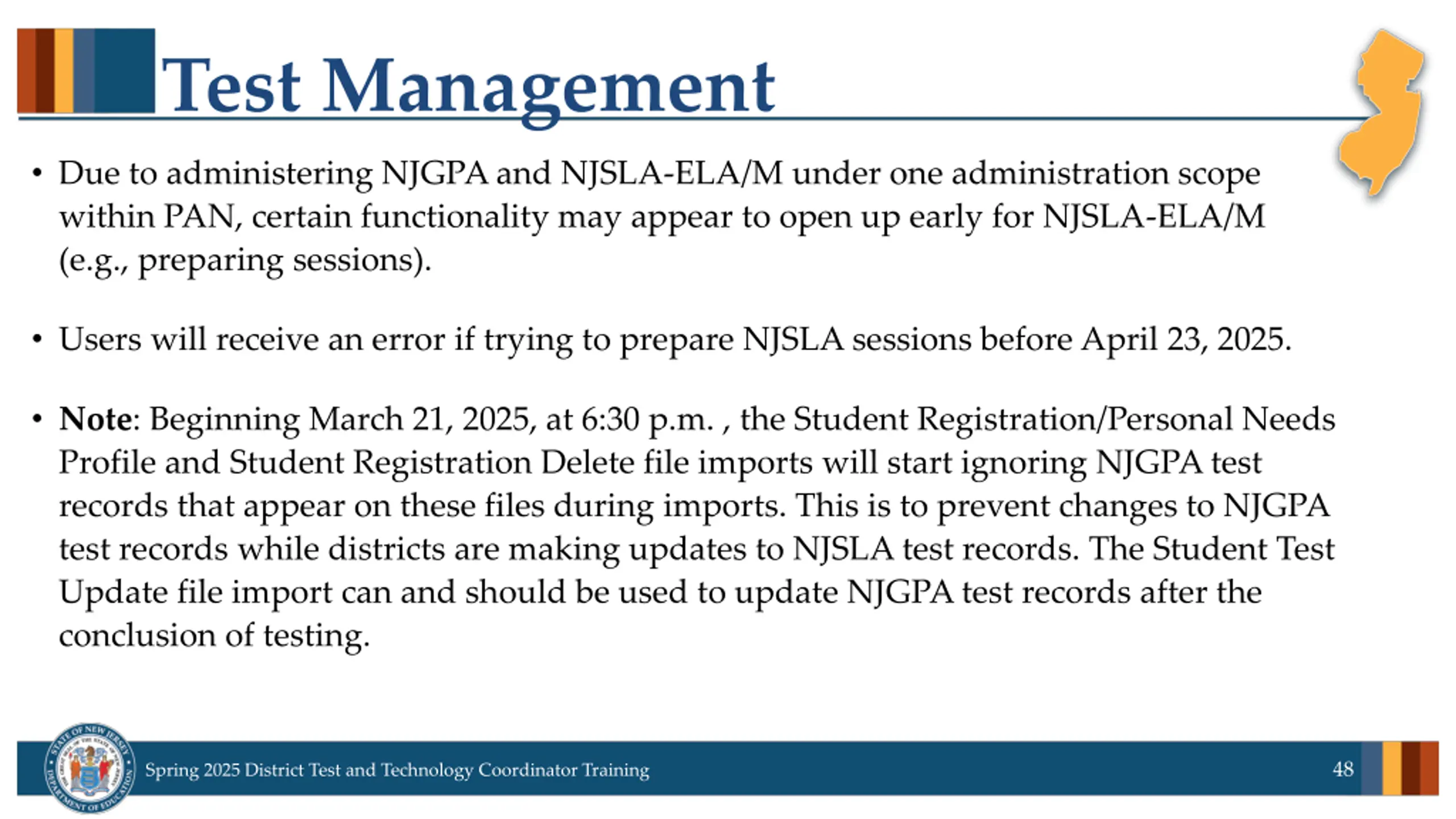 Test Management Due to administering NJGPA and NJSLA-ELA/M under one administration scope within PAN, certain functionality may appear to open up early for NJSLA-ELA/M (e.g., preparing sessions). Users will receive an error if trying to prepare NJSLA sessions before April 23, 2025. Note: Beginning March 21, 2025, at 6:30 p.m. , the Student Registration/Personal Needs Profile and Student Registration Delete file imports will start ignoring NJGPA test records that appear on these files during imports. This is to prevent changes to NJGPA test records while districts are making updates to NJSLA test records. The Student Test Update file import can and should be used to update NJGPA test records after the conclusion of testing. 48 Spring 2025 District Test and Technology Coordinator Training