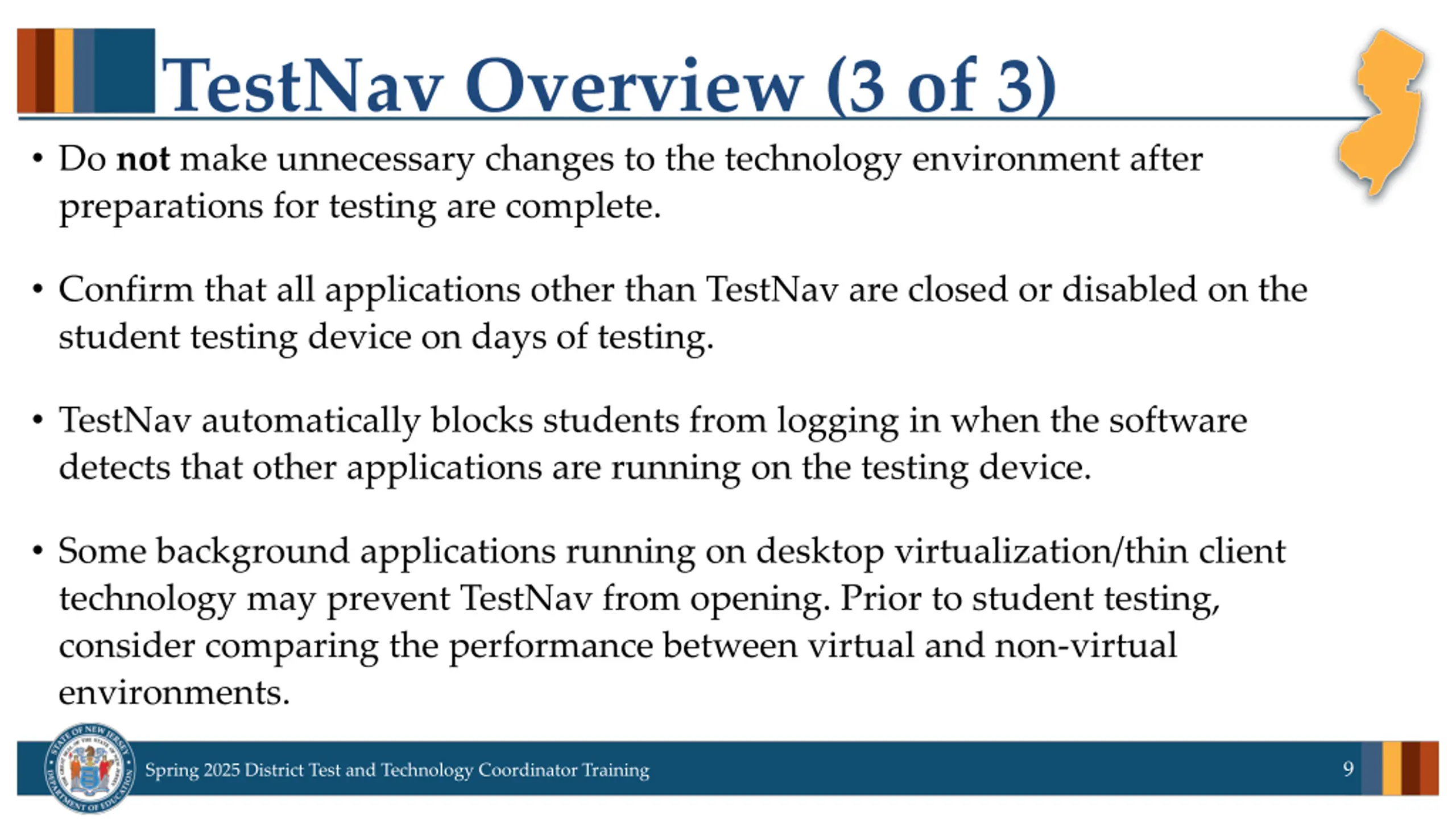TestNav Overview (3 of 3) Do not make unnecessary changes to the technology environment after preparations for testing are complete. Confirm that all applications other than TestNav are closed or disabled on the student testing device on days of testing. TestNav automatically blocks students from logging in when the software detects that other applications are running on the testing device. Some background applications running on desktop virtualization/thin client technology may prevent TestNav from opening. Prior to student testing, consider comparing the performance between virtual and non-virtual environments. 9 Spring 2025 District Test and Technology Coordinator Training