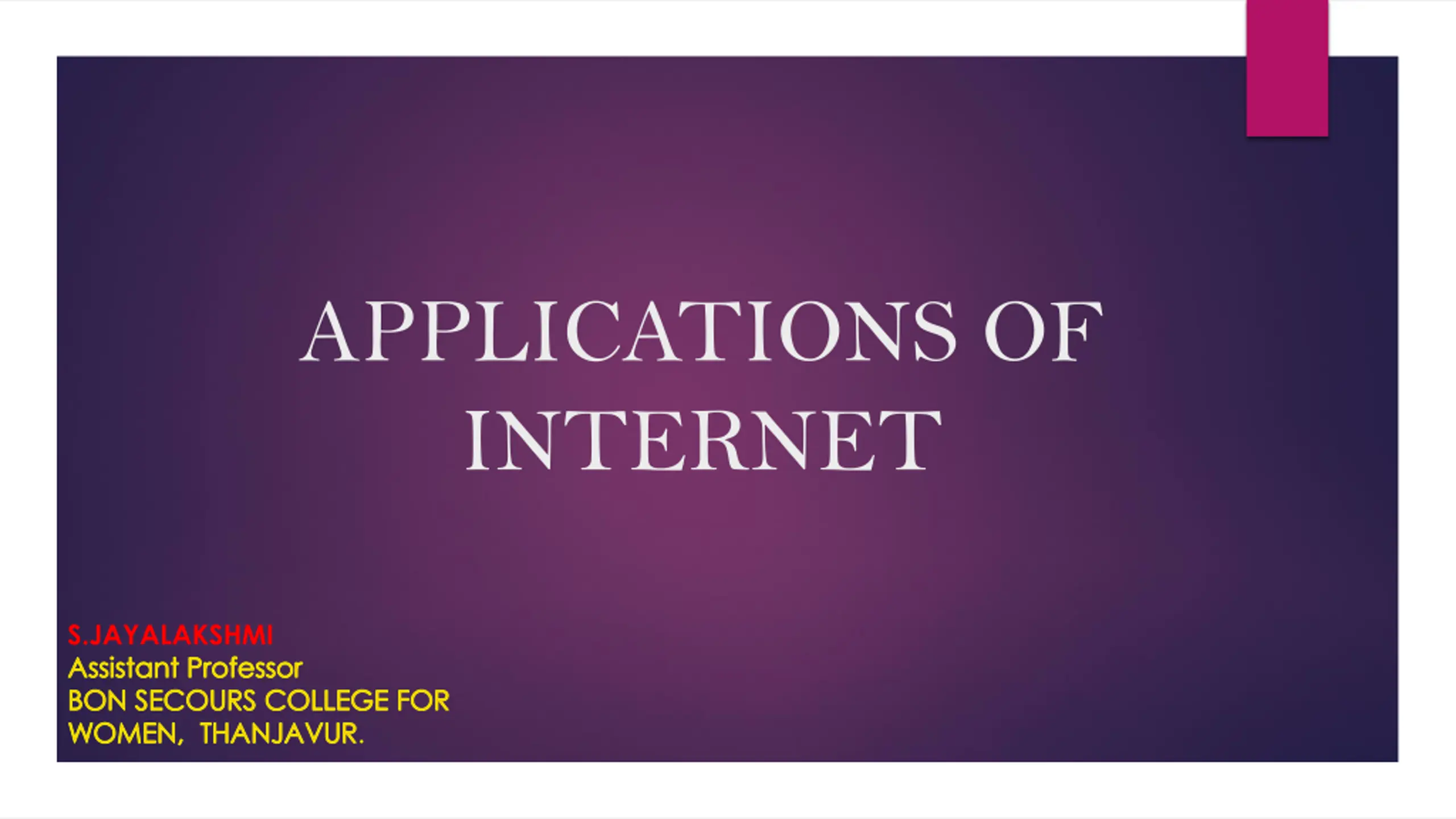 APPLICATIONS OF INTERNET S.JAYALAKSHMI Assistant Professor BON SECOURS COLLEGE FOR WOMEN, THANJAVUR.