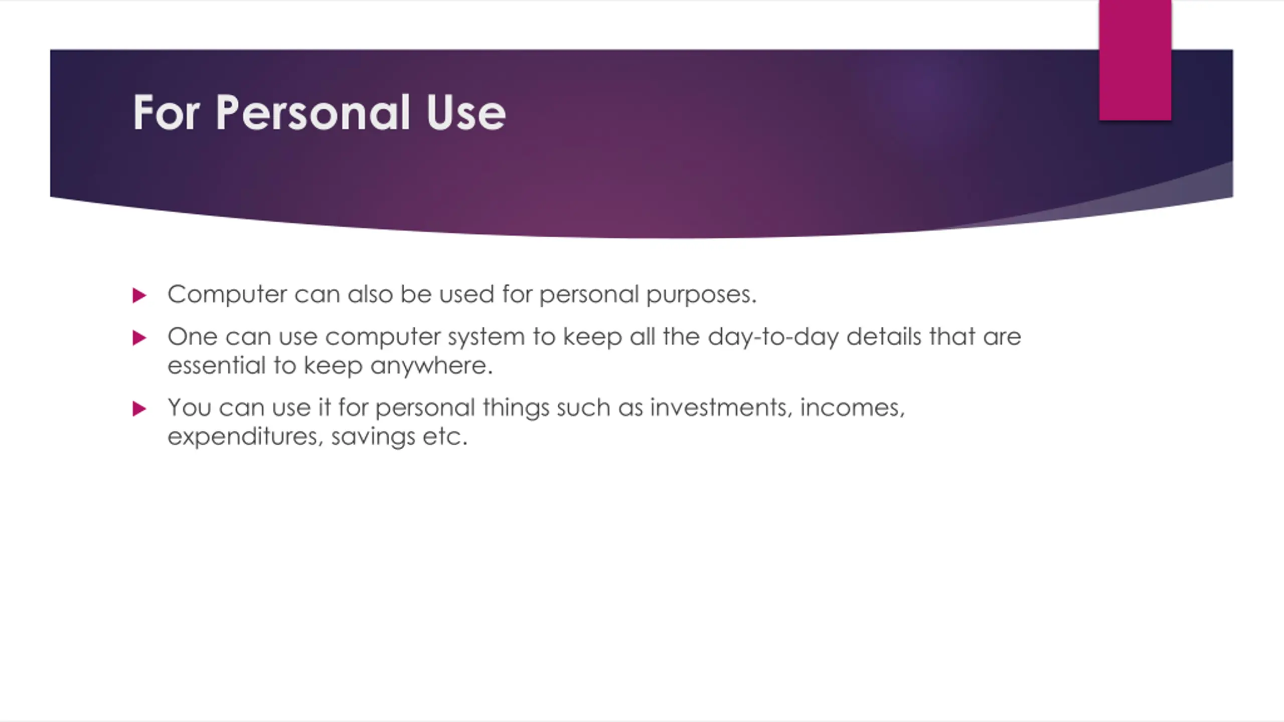 For Personal Use Computer can also be used for personal purposes. One can use computer system to keep all the day-to-day details that are essential to keep anywhere. You can use it for personal things such as investments, incomes, expenditures, savings etc.