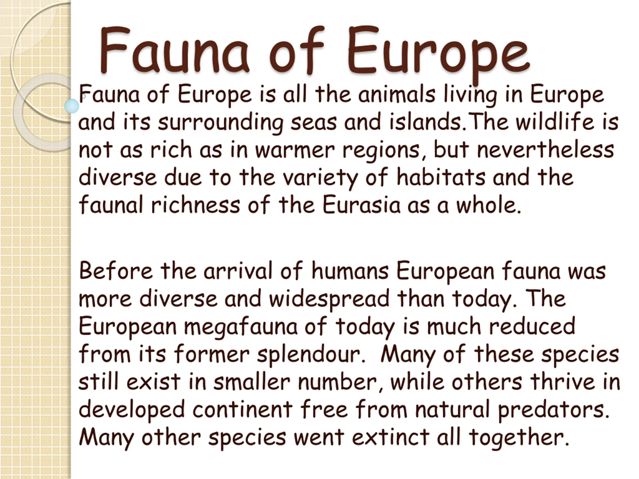 Fauna of Europe Fauna of Europe is all the animals living in Europe and its surrounding seas and islands.The wildlife is not as rich as in warmer regions, but nevertheless diverse due to the variety of habitats and the faunal richness of the Eurasia as a whole. Before the arrival of humans European fauna was more diverse and widespread than today. The European megafauna of today is much reduced from its former splendour. Many of these species still exist in smaller number, while others thrive in developed continent free from natural predators. Many other species went extinct all together.